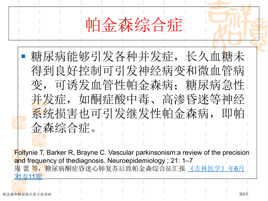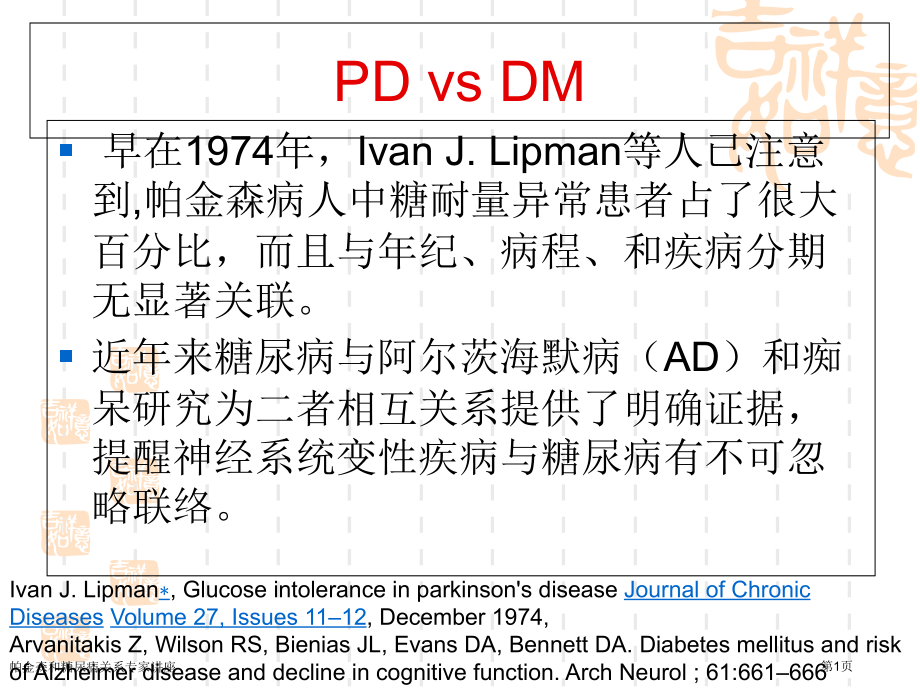 ,单击此处编辑母版标题样式,单击此处编辑母版文本样式,第二级,第三级,第四级,第五级,*,单击此处编辑母版标题样式,单击此处编辑母版文本样式,第二级,第三级,第四级,第五级,*,PD vs DM,早在,1974,年,,Ivan J.Lipman,等人已注意到,帕金森病人中糖耐量异常患者占了很大百分比,而且与年纪、病程、和疾病分期无显著关联。,近年来糖尿病与阿尔茨海默病(,AD,)和痴呆研究为二者相互关系提供了明确证据,提醒神经系统变性疾病与糖尿病有不可忽略联络。,Ivan J.Lipman,Glucose intolerance in parkinsons disease,Journal of Chronic Diseases,Volume 27,Issues 1112,December 1974,Arvanitakis Z,Wilson RS,Bienias JL,Evans DA,Bennett DA.Diabetes mellitus and risk of Alzheimer disease and decline in cognitive function.Arch Neurol;61:661666,帕金森和糖尿病关系专家讲座,第1页,帕金森综合症,糖尿病能够引发各种并发症,长久血糖未得到良好控制可引发神经病变和微血管病变,可诱发血管性帕金森病;糖尿病急性并发症,如酮症酸中毒、高渗昏迷等神经系统损害也可引发继发性帕金森病,即帕金森综合症。,Foltynie T,Barker R,Brayne C.Vascular parkinsonism:a review of the precision and frequency of thediagnosis.Neuroepidemiology;21:17,周 蕾 等,糖尿病酮症昏迷心肺复苏后致帕金森综合征汇报,吉林医学,年,6,月,31,卷,11,期,帕金森和糖尿病关系专家讲座,第2页,流行病学调查,正相关,负相关或无关,帕金森和糖尿病关系专家讲座,第3页,发表时间,,年 样本量,,7,274,人 国家,,UK,病例对照研究:选择,1994-,年间首次诊疗为帕金森病患者,并从数据库中寻找匹配对照组。,校正,BMI,、吸烟、高血压、,COPD,等慢性疾病后 帕金森病与非帕金森病患者中糖尿病患病率基本相等,OR=0.95(95%CI 0.801.14),帕金森和糖尿病关系专家讲座,第4页,队列研究,排除研究起始点时首次诊疗为帕金森病且有糖尿病、肿瘤、,HIV,感染、酒精或药品成瘾等病史者,观察至研究结束糖尿病发病情况。,帕金森病患者糖尿病发病率低于非帕金森病患者,RR=0.55(95%CI 0.380.81),帕金森和糖尿病关系专家讲座,第5页,巢式病例对照研究,研究期间每新出现一例首次诊疗为糖尿病患者,考虑年纪、性别等原因寻找匹配对照组四例,观察两组受调查对象帕金森病患病情况,治疗情况等指标。,含有帕金森病史患者糖尿病发病率低于对照组,OR=0.53 95%CI 0.330.87,帕金森和糖尿病关系专家讲座,第6页,报道负相关或无关研究,CCS:casecontrol study;DCS;death certicate based study;CS;cohort study;cross-sectional study:CSS,帕金森和糖尿病关系专家讲座,第7页,报道负相关或无关研究,Marco DAmelio,.et al.Diabetes preceding Parkinsons disease onset.A casecontrol study Parkinsonism and Related Disorders 15()660664,帕金森和糖尿病关系专家讲座,第8页,含有负相关可能原因,吸烟:吸烟已被公认为糖尿病发病高危原因,但尼古丁对帕金森亦有明确保护作用。(,Quik M.Smoking,nicotine and Parkinsons disease.Trends Neurosci;27:5618.,),帕金森患者人群中可观察到血浆皮质醇水平下降,血糖降低,代谢功效下降和体重下降,其机制与交感神经系统活性减低相关。,(,Scigliano G.Reduced risk factors for vascular disorders in Parkinson disease patients:a casecontrol study.Stroke;37:11848,Kenichi,Kashihara.Weight loss in Parkinsons disease.J Neurol()DOI 10.1007/s00415-006-7009-0,),乙酰化酶(,Sirtuin,)家族对帕金森和糖尿病可能有相反作用。,帕金森和糖尿病关系专家讲座,第9页,surtuin,基因调控中缄默信息调整因子,2,(,sir2,)同源蛋白质统称为,Surtuins.,哺乳动物,Sirtuin,可与,p53 FOXO PGC 1 NF-KB Ku70,等蛋白相互作用调控着细胞,可能包括转录、细胞周期、细胞分化、凋亡、应激、代谢及基因组稳定。,帕金森和糖尿病关系专家讲座,第10页,SIRT1,与糖尿病,Schwer B,Verdin E()Conserved metabolic regulatory functions of sirtuins.,Cell Metab,.7:104122.,帕金森和糖尿病关系专家讲座,第11页,SIRT2,与帕金森,Tiago,等人发觉,,Sirtuin2,抑制剂,AGK2,能够降低细胞内或果蝇内,-synuclein,对多巴胺能神经元毒性作用。,Tiago Fleming et al.Sirtuin 2 Inhibitors Rescue-Synuclein,Mediated Toxicity in Models of Parkinsons Disease.21 June()10.1126 science.1143780,帕金森和糖尿病关系专家讲座,第12页,发表年份:,年 国家:,USA,样本量:,288,622,研究方式:队列研究,研究结果:糖尿病患者中帕金森病发病风险较非糖尿病患者高约,40%,(OR=1.41 95%CI 1.201.66),高风险人群主要集中在糖尿病发病,10,年以上者。(,OR=,1.75 1.362.25)。,帕金森和糖尿病关系专家讲座,第13页,Diabetes and the Risk of Developing Parkinsons Diseasein Denmark,发表年份:,年 国家:丹麦,样本量:,11,582,研究方式:病例对照研究,研究结果:糖尿病患者中帕金森病发病风险较非糖尿病患者高约,36%,(OR=1.36 95%CI 1.081.71),早发性帕金森患者,(,发病年纪小于,60,岁,),表现出二者关系更为显著。,(OR=3.07 1.655.70).,帕金森和糖尿病关系专家讲座,第14页,发表年份:,年 国家:芬兰,随访时间:,18,年 样本量:,51,552,研究方式:队列研究,研究结果:,糖尿病患者帕金森发病风险增高(,OR=1.85(CI 1.232.80),),调整血压、,BMI,、教育、锻炼、吸烟饮酒、咖啡摄入等影响后对最终止果影响较小。,帕金森和糖尿病关系专家讲座,第15页,帕金森病与糖尿病间可能联络,共同病因学基础:,肥胖,衰老,慢性毒物接触引发慢性炎症和氧化应激,发病机制,:,胰岛素抵抗,-,线粒体功效障碍,-,多巴胺能神经元缺失,帕金森和糖尿病关系专家讲座,第16页,肥胖(,BMI,),肥胖,帕金森病,糖尿病,肥胖提升帕金森病发病风险(