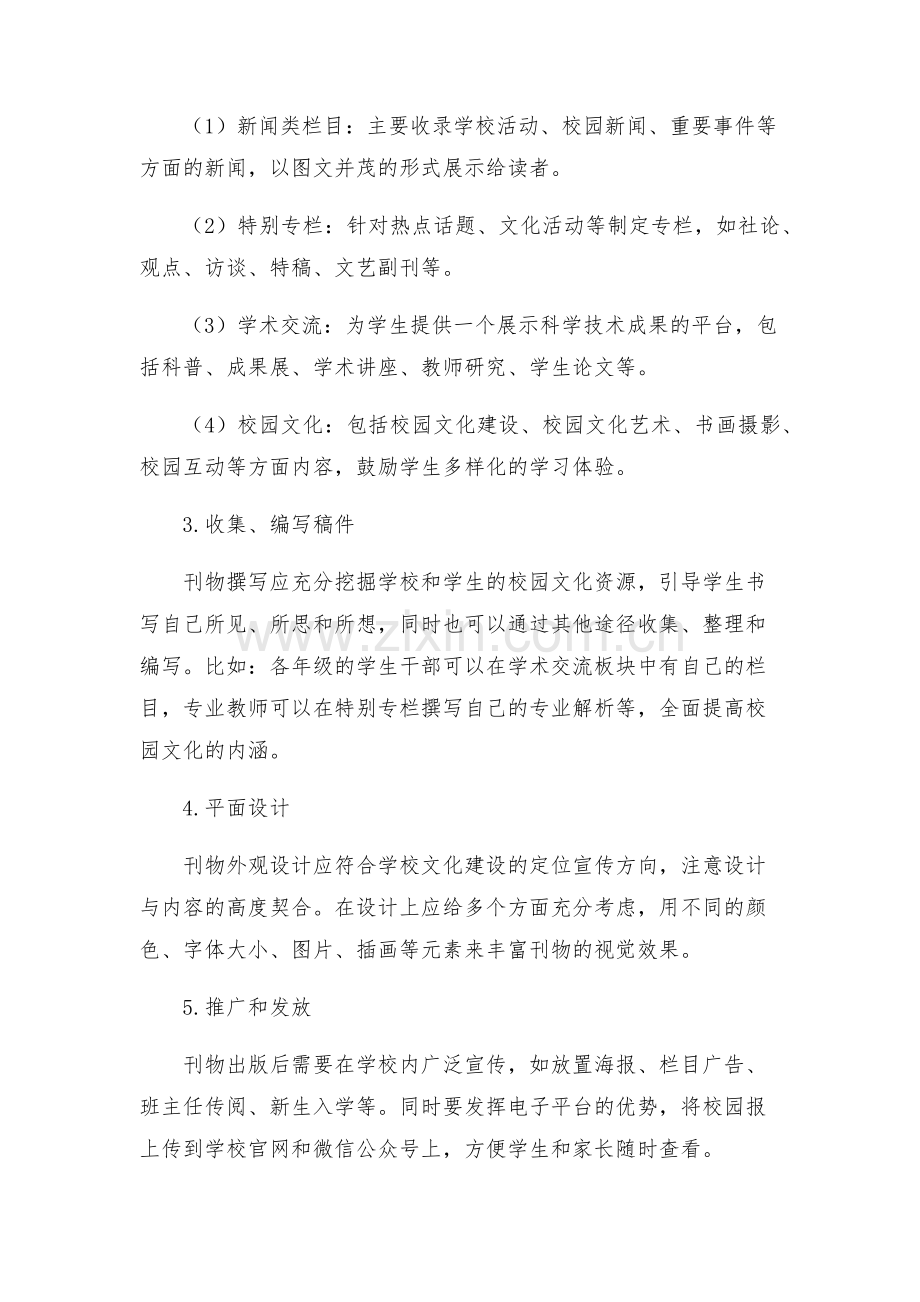 刊物撰写应充分挖掘学校和学生的校园文化资源,引导学生书写自己所见、所思和所想,同时也可以通过其他途径收集、整理和编写。比如:各年级的学生干部可以在学术交流板块中有自己的栏目,专业教师可以在特别专栏撰写自己的专业解析等,全面提高校园文化的内涵。