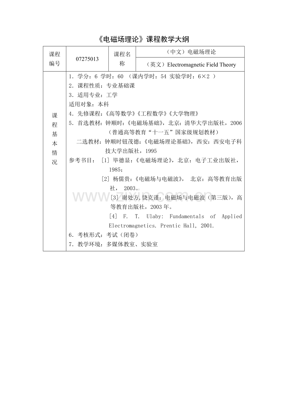 5.首选教材:钟顺时:《电磁场基础》,北京:清华大学出版社,2006(普通高等教育“十一五”国家级规划教材)