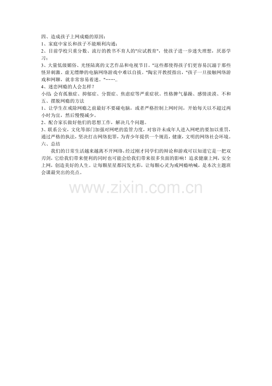 我们的日常生活越来越离不开网络,经过刚才同学们的辩论和游戏可以知道它是一把双刃剑,它给我们带来便利的同时也可能会给我们带来很多负面的影响!追求健康上网,安全上网,创造美好的人生。让每颗星星都闪发光彩,让每颗心灵为戒网瘾呐喊,是本次主题班会课最突出的亮点。