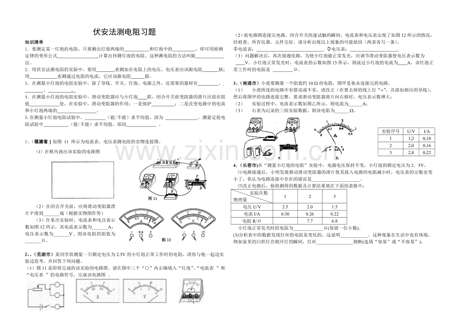 2.用伏安法测电阻的实验中,要用 表测加在电阻上的电压,电压表应该跟电阻 联;用 表测通过电阻的电流,它应该跟电阻 联。