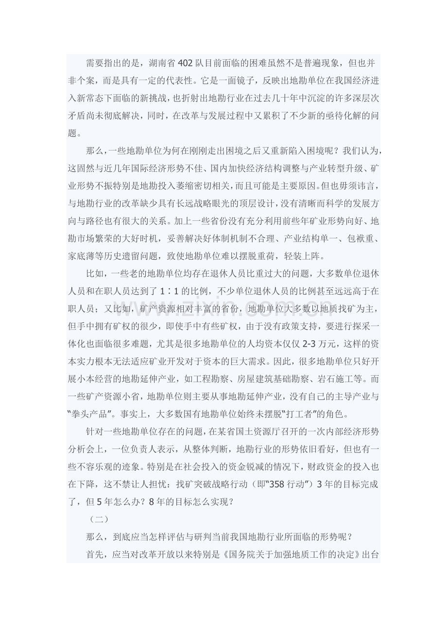 需要指出的是,湖南省402队目前面临的困难虽然不是普遍现象,但也并非个案,而是具有一定的代表性。它是一面镜子,反映出地勘单位在我国经济进入新常态下面临的新挑战,也折射出地勘行业在过去几十年中沉淀的许多深层次矛盾尚未彻底解决,同时,在改革与发展过程中又累积了不少新的亟待化解的问题。