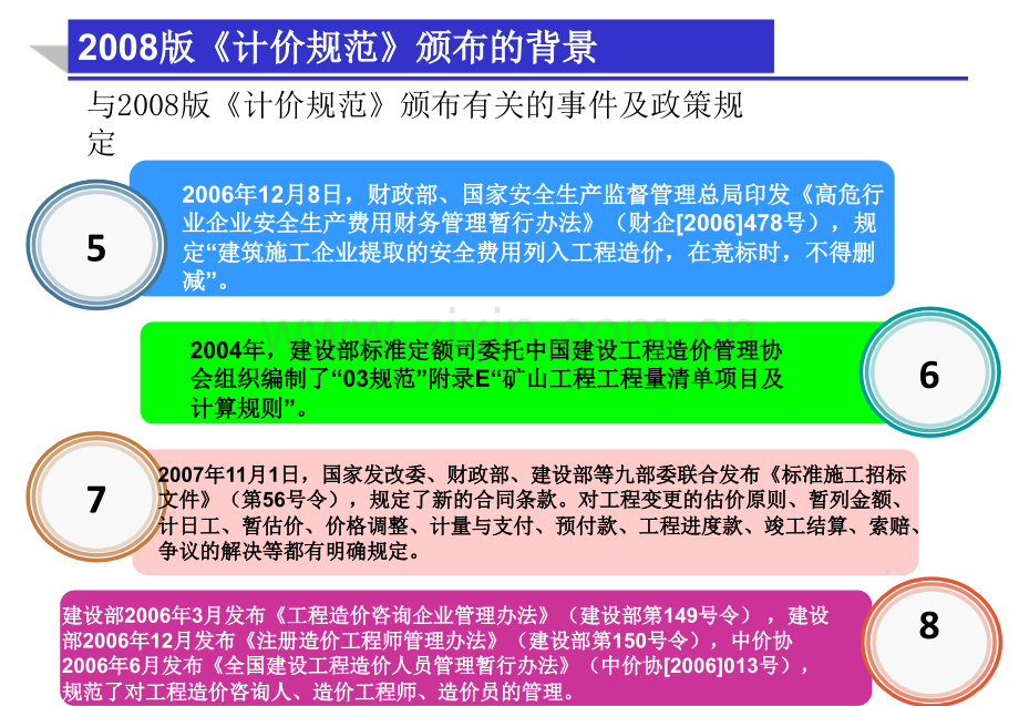 12008版版计价规范计价规范颁布的背景颁布的背景与2008版计价规范颁布有关的事件及政策规定1234国务院从国务院从2003年起,在全国范围开展清理拖欠工程款、清理拖欠农民工工资的年起,在全国范围开展清理拖欠工程款、清理拖欠农民工工资的活动。最高人民法院于活动。最高人民法院于2004年年9月月29日发布了日发布了关于审理建设工程施工合同纠关于审理建设工程施工合同纠纷案件适用法律问题的解释纷案件适用法律问题的解释该解释多条涉及工程合同条款如何认定的问题,该解释多条涉及工程合同条款如何认定的问题,为规范工程计价行为提供了法律保障。为规范工程计价行为提供了法律保障。财政部、建设部于财政部、建设部于2004年年10月月20日印发了日印发了建设工程价款结算暂行办法建设工程价款结算暂行办法(财建(财建2004369号),号),2007年中国造价管理协会发布了协会标准年中国造价管理协会发布了协会标准建设建设项目工程结算编审规程项目工程结算编审规程(CECAGC3-2007),对工程结算进行了规范。,对工程结算进行了规范。2003年年10月月15日,建设部、财政部印发了日,建设部、财政部印发了建筑安装工程费建筑安装工程费用项目组成用项目组成(建标(建标2003206号),提出了措施费和规费的号),提出了措施费和规费的概念。概念。2005年年6月月7日,建设部办公厅印发了日,建设部办公厅印发了建筑工程安全防护、文明建筑工程安全防护、文明施工措施费及使用管理规定施工措施费及使用管理规定(建办(建办200589号),明确规定上号),明确规定上述费用由述费用由建筑安装工程费用项目组成建筑安装工程费用项目组成中的文明施工费、环境中的文明施工费、环境保护费、临时设施费、安全施工费组成。保护费、临时设施费、安全施工费组成。22008版版计价规范计价规范颁布的背景颁布的背景与2008版计价规范颁布有关的事件及政策规定56782006年年12月月8日,财政部、国家安全生产监督管理总局印发日,财政部、国家安全生产监督管理总局印发高危行高危行业企业安全生产费用财务管理暂行办法业企业安全生产费用财务管理暂行办法(财企(财企2006478号),规号),规定定“建筑施工企业提取的安全费用列入工程造价,在竞标时,不得删建筑施工企业提取的安全费用列入工程造价,在竞标时,不得删减减”。2004年,建设部标准定额司委托中国建设工程造价管理协年,建设部标准定额司委托中国建设工程造价管理协会组织编制了会组织编制了“03规范规范”附录附录E“矿山工程工程量清单项目及矿山工程工程量清单项目及计算规则计算规则”。2007年年11月月1日,国家发改委、财政部、建设部等九部委联合发布日,国家发改委、财政部、建设部等九部委联合发布标准施工招标标准施工招标文件文件(第(第56号令),规定了新的合同条款。对工程变更的估价原则、暂列金额、号令),规定了新的合同条款。对工程变更的估价原则、暂列金额、计日工、暂估价、价格调整、计量与支付、预付款、工程进度款、竣工结算、索赔、计日工、暂估价、价格调整、计量与支付、预付款、工程进度款、竣工结算、索赔、争议的解决等都有明确规定。争议的解决等都有明确规定。建设部建设部2006年年3月发布月发布工程造价咨询企业管理办法工程造价咨询企业管理办法(建设部第(建设部第149号令)号令),建设,建设部部2006年年12月发布月发布注册造价工程师管理办法注册造价工程师管理办法(建设部第(建设部第150号令),中价协号令),中价协2006年年6月发布月发布全国建设工程造价人员管理暂行办法全国建设工程造价人员管理暂行办法(中价协(中价协2006013号),号),规范了对工程造价咨询人、造价工程师、造价员的管理。规范了对工程造价咨询人、造价工程师、造价员的管理。3 2011造价造价员培培训工程量清单计价规则工程量清单计价规则工程量清单计价规则工程量清单计价规则1 1 总则总则2 2 术语术语3 3 工程量清单编制工程量清单编制 3.1 3.1 一般规定一般规定 3.2 3.2 分部分项工程量清单分部分项工程量清单 3.3 3.3 措施项目清单措施项目清单 3.4 3.4 其他项目清单其他项目清单 3.5 3.5 规费清单规费清单 3.6 3.6 税金项目清单税金项目清单4 4 工程量清单计价工程量清单计价 4.1 4.1 一般规定一般规定 4.2 4.2 招标控制价(招标控制价(招标最高限价招标最高限价)4.3 4.3 投标价投标价 4.4 4.4 工程合同价款的约定工程合同价款的约定 4.5 4.5 工程计量与价款支付工程计量与价款支付 4.6 4.6 索赔与现场签证索赔与现场签证 4.7 4.7 工程价款调整工程价款调整 4.8 4.8 竣工结算竣工结算 4.9 4.9 工程计价争议处理工程计价争议处理5 5 工程量清单计价表格工程量清单计价表格 5.1 5.1 计价表格组成计价表格组成 5.2 5.2 计价表格使用规定计价表格使用规定新新规范规范的基本内容和亮点的基本内容和亮点 一一.新新规范规范的基本内容的基本内容 20032003版版计价规范计价规范正文条文共正文条文共4545条,附录条,附录5 5个。而个。而20082008版版计价规范计价规范正文条正文条文共文共136136条,条,附录附录6 6个个。新规范主要修订了原规范正文中不尽合理、不够完善、可操。新规范主要修订了原规范正文中不尽合理、不够完善、可操作性不强的条款及表格形式,补充完善了工程
