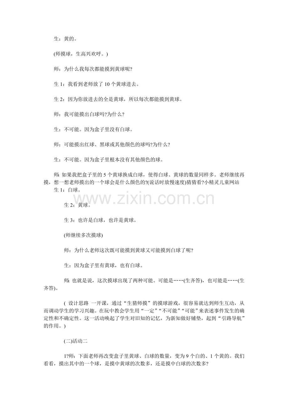 ( 设计思路 一开课,通过“生猜师摸”的摸球游戏,很容易就达到师生互动,从而调动学生的学习兴趣。在玩中教会学生用“一定”“不可能”“可能”来表述事件发生的确定性和不确定性。这一活动唤起了学生对旧知的记忆,为新知做好铺垫,起到“引路导航”的作用。)