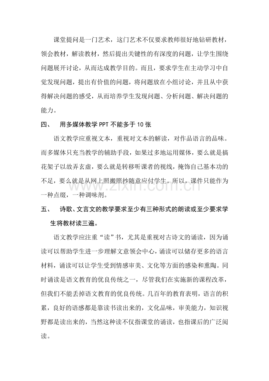 一节课45分钟老师讲课不得超过20分钟,讲课包括导语,提示语,过渡语,点拨语,评价语和总结语等,其余时间都应交给学生。这表面上看是解放教师,实际上对教师的要求更高了:要求教师深入钻研教材,准确地把握教材;要求教师的教学语言准确而精炼,科学而简洁;要求教师有很强的课堂调控能力。