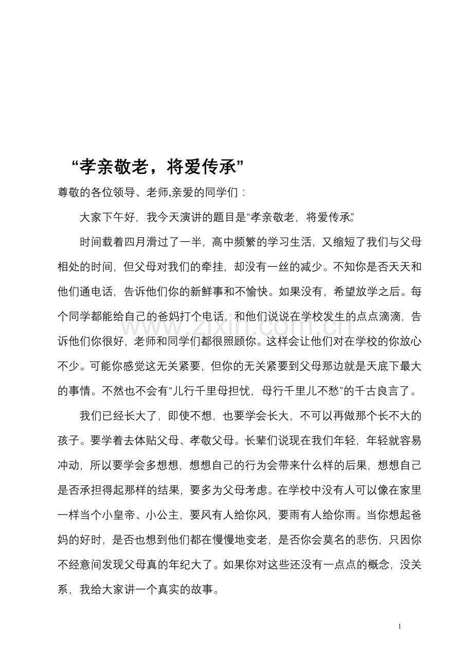 大家下午好,我今天演讲的题目是“孝亲敬老,将爱传承”。