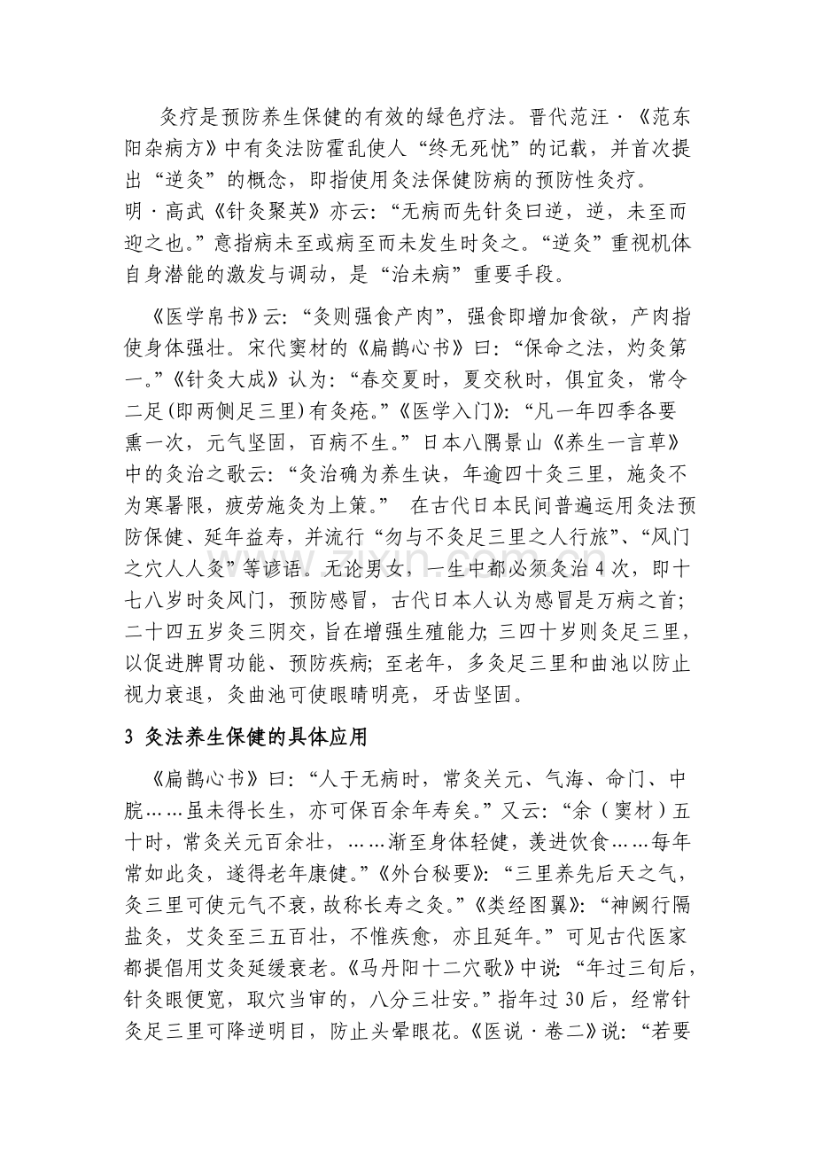 《扁鹊心书》曰:“人于无病时,常灸关元、气海、命门、中脘……虽未得长生,亦可保百余年寿矣。”又云:“余(窦材)五十时,常灸关元百余壮,……渐至身体轻健,羡进饮食……每年常如此灸,遂得老年康健。”《外台秘要》:“三里养先后天之气,灸三里可使元气不衰,故称长寿之灸。”《类经图翼》:“神阙行隔盐灸,艾灸至三五百壮,不惟疾愈,亦且延年。”可见古代医家都提倡用艾灸延缓衰老。《马丹阳十二穴歌》中说:“年过三旬后,针灸眼便宽,取穴当审的,八分三壮安。”指年过30后,经常针灸足三里可降逆明目,防止头晕眼花。《医说·卷二》说:“若要身体安,三里常不干。” 《类经图翼》云:“旅行灸三里,健步行如飞。”王执中的《针灸资生经·第三·虚损》云:“气海者,元气之海也……宜频灸此穴,以壮元阳,若必待疾作而后灸,恐失之晚也。”《江间式心身锻炼法》:“无病常寿法,每月必有十日灸足三里,寿至二百余岁。” 隋·巢元方在《诸病源候论·卷四十五》中提出“河洛间土地多寒,儿喜病痉,其俗生儿三日喜逆灸以防之,又灸颊以防噤”。明代的杨继洲在《针灸大成》中指出“宜急灸三里、绝骨四处各三壮”以预防中风。可见当时人们已经意识到保健灸可预防传染病﹑常见病的发生。唐代孙思邈是艾灸“治未病”的积极倡导者,他指出“膏肓灸无所不治”,“此灸讫,令人阳气康盛”。《千金方》中艾灸多于针刺,提倡“凡人家居及远行,随身常有熟艾一升”以防病。在日本民间提倡婴儿期灸身柱,即婴儿出生后不久,用小麦粒大的艾炷灸身柱穴,3壮左右,连续灸二三日至十数日不等,可以促进健康发育。