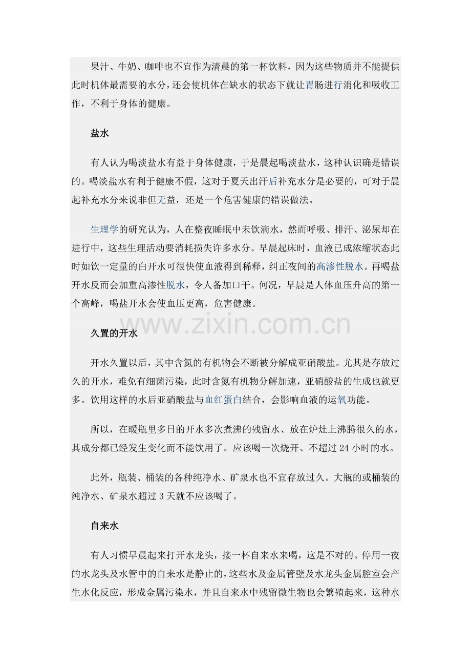 生理学的研究认为,人在整夜睡眠中未饮滴水,然而呼吸、排汗、泌尿却在进行中,这些生理活动要消耗损失许多水分。早晨起床时,血液已成浓缩状态此时如饮一定量的白开水可很快使血液得到稀释,纠正夜间的高渗性脱水。再喝盐开水反而会加重高渗性脱水,令人备加口干。何况,早晨是人体血压升高的第一个高峰,喝盐开水会使血压更高,危害健康。