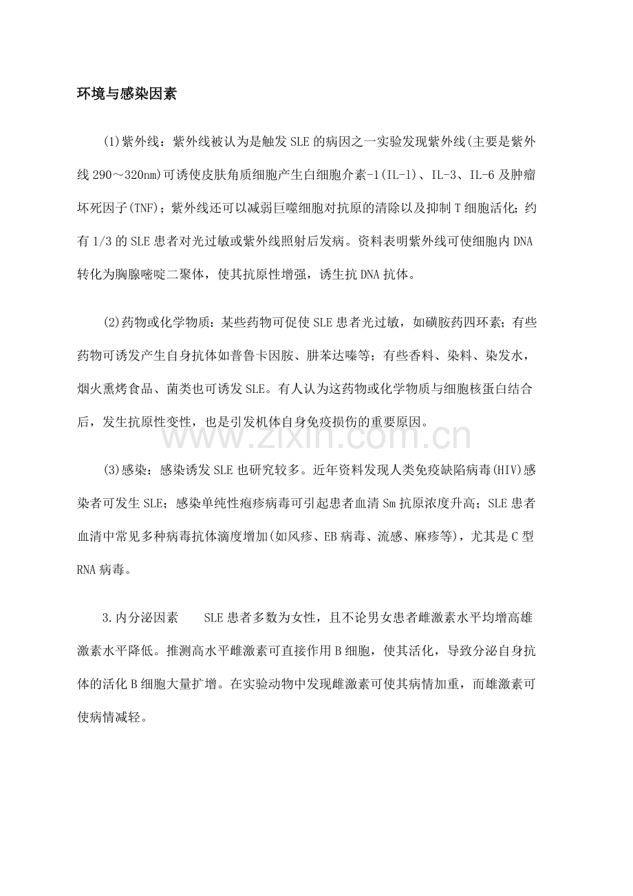 (3)感染:感染诱发SLE也研究较多。近年资料发现人类免疫缺陷病毒(HIV)感染者可发生SLE;感染单纯性疱疹病毒可引起患者血清Sm抗原浓度升高;SLE患者血清中常见多种病毒抗体滴度增加(如风疹、EB病毒、流感、麻疹等),尤其是C型RNA病毒。
