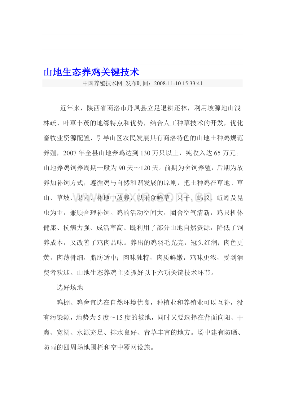 近年来,陕西省商洛市丹凤县立足退耕还林,利用坡源地山浅林疏、叶草丰茂的地缘特点和优势,结合人工种草技术的开发,优化畜牧业资源配置,引导山区农民发展具有商洛特色的山地土种鸡规范养殖,2007年全县山地养鸡达到130万只以上,纯收入达65万元。山地养鸡饲养周期一般为90天~120天。前期为舍饲养殖,后期为放养加补饲方式,遵循鸡与自然和谐发展的原则,把土种鸡在草地、草山、草坡、果园、林地中放养,以采食鲜草、果子、蚂蚁、蚯蚓及昆虫为主,兼顾合理补饲。鸡的活动空间大,圈舍空气清新,鸡只机体健康、抗病力强、成活率高。既利用了部分山地自然资源,降低了饲养成本,又改善了鸡肉品味。养出的鸡羽毛光亮,冠头红润;肉色更黄,肉薄骨细,脂肪适中;肉味独特,肉质鲜嫩,鸡味更浓,受到消费者欢迎。山地生态养鸡主要抓好以下六项关键技术环节。