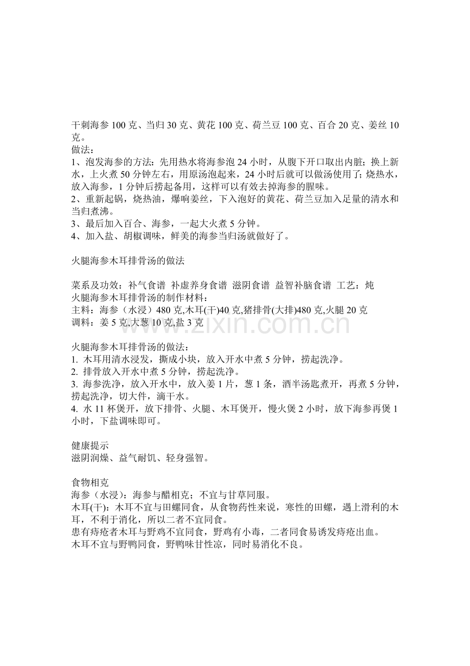 主料:海参(水浸)480克,木耳(干)40克,猪排骨(大排)480克,火腿20克
