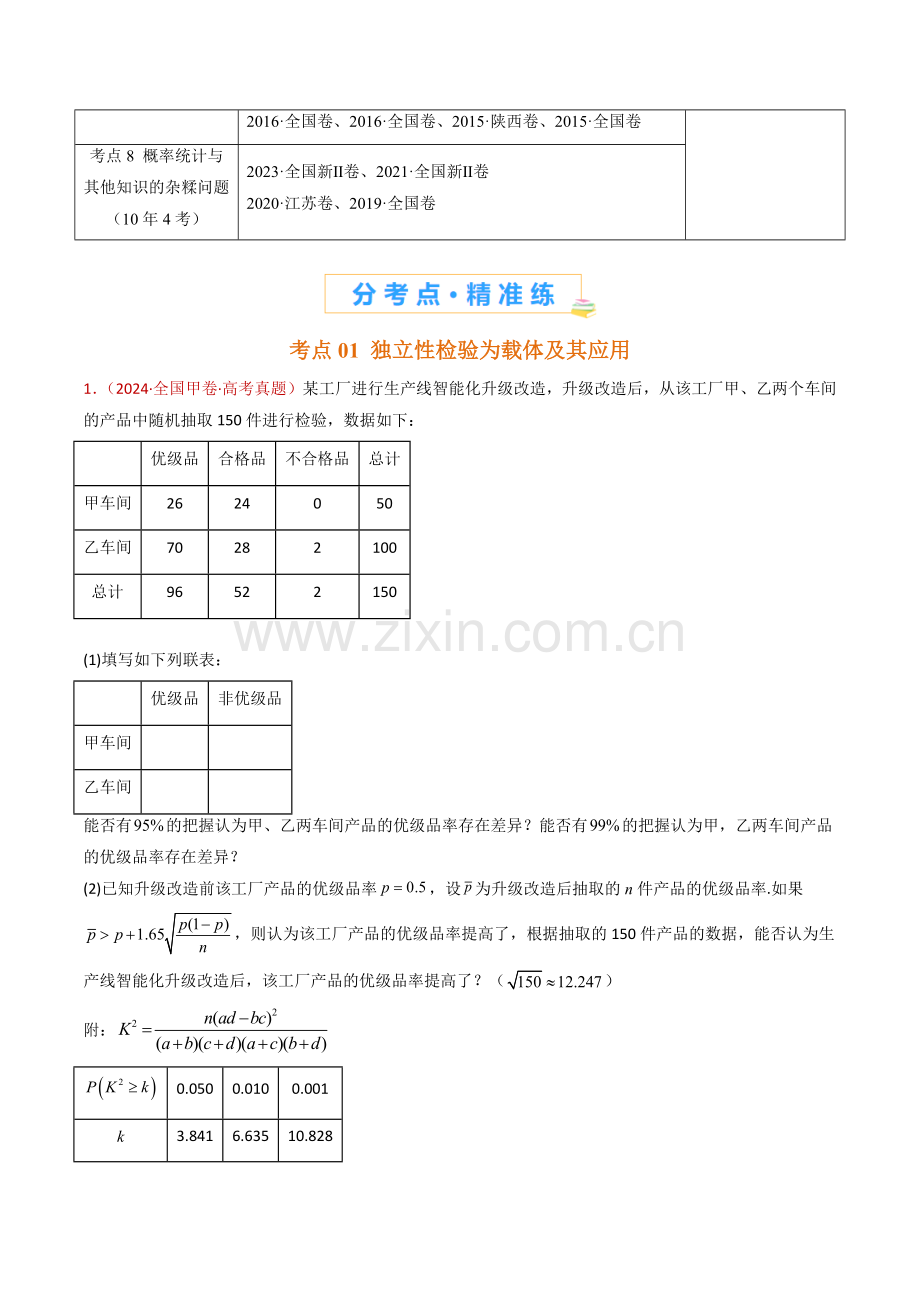 1.(2024·全国甲卷·高考真题)某工厂进行生产线智能化升级改造,升级改造后,从该工厂甲、乙两个车间的产品中随机抽取150件进行检验,数据如下: