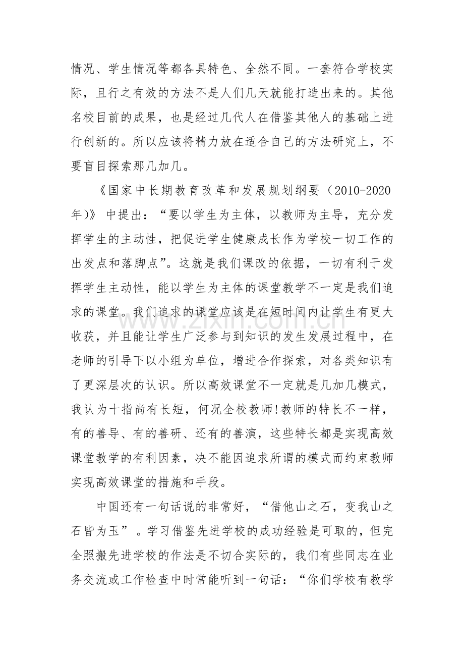 《国家中长期教育改革和发展规划纲要(2010-2020年)》 中提出:“要以学生为主体,以教师为主导,充分发挥学生的主动性,把促进学生健康成长作为学校一切工作的出发点和落脚点”。这就是我们课改的依据,一切有利于发挥学生主动性,能以学生为主体的课堂教学不一定是我们追求的课堂。我们追求的课堂应该是在短时间内让学生有更大收获,并且能让学生广泛参与到知识的发生发展过程中,在老师的引导下以小组为单位,增进合作探索,对各类知识有了更深层次的认识。所以高效课堂不一定就是几加几模式,我认为十指尚有长短,何况全校教师!教师的特长不一样,有的善导、有的善研、还有的善演,这些特长都是实现高效课堂教学的有利因素,决不能因追求所谓的模式而约束教师实现高效课堂的措施和手段。