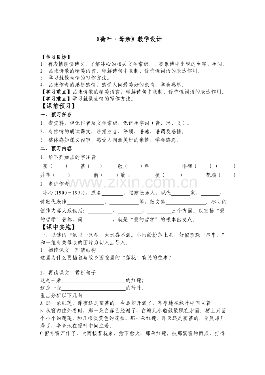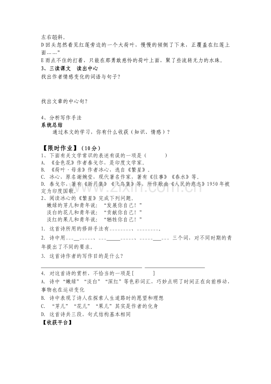 1、有表情朗读诗文,了解冰心的相关文学常识,,积累诗中出现的生字、生词。