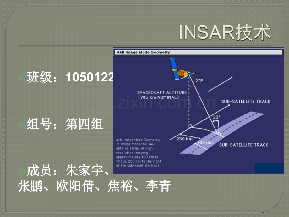 INSAR技术班级:班级:1050122组号:第四组组号:第四组成员:朱家宇、成员:朱家宇、张鹏、欧阳倩、焦裕、李青张鹏、欧阳倩、焦裕、李青INSAR技术简介(百度)主要研究领域(现代测绘网)地震灾害中的应用(屈春燕 单新建等)利用SAR相干系数图像的失相干性来探讨震害程度(屈春燕 单新建等)总结(第四小组)简介合成孔径雷达干涉测量技术(INSAR,Interferometric Synthetic Aperture Radar;简称:干涉雷达测量)是以同一地区的两张SAR图像为基本处理数据,通过求取两幅SAR图像的相位差,获取干涉图像,然后经相位解缠,从干涉条纹中获取地形高程数据的空间对地观测新技术。简介INSAR最初设计是用来对地球表面测图,目前INSAR技术的应用已不仅仅涉及地形测图,还广泛应用在数字高程模型、洋流、水文、森林、海岸带、变化监测、地面沉降、火山灾害、地震活动、极地研究等诸多领域。其特点为:全天时、全天候、相位信息等。主要研究领域1.数字高程模型(DEM)的获取:INSAR技术可以全天候、全天时、大面积、精度、快速准确地获取覆盖全世界的数字高程图,特别是在某些困难地区用传统测量方法无法涉及的地方,优势更为明显。SRTM数据覆盖范围(深色区域)(JPL网站)主要研究领域2.地图测绘:利用传统测绘方法测图不仅费时费力,而且高程精度不高。利用INSAR技术可以解决这一问题,现在利用INSAR技术在平坦地区可以取得2m左右的高程精度,地形起伏较大的地区高程精度可以达到5m左右,完全可以满足实际需要。InSARInSAR提取的提取的DEMDEM(每个干涉条纹代表(每个干涉条纹代表160m160m高程)高程)主要研究领域3.海洋应用:利用INSAR可以测量海浪方向和海表面流速,还可测量海面高度,进而计算海浪高度,此外,INSAR还可用于舰船监测、海岸线的动态监测。主要研究领域4.地球动力学应用:INSAR技术在地球动力学方面的应用最令人瞩目,主要包括以下几个方面:(1)地震形变研究,包括同震、震间、震后的机理研究。中国汶川大地震(2008)、海地地震、中国玉树地震(2010)等。这些研究均主要利用INSAR技术获取同震位移和震后形变,分析由于地震的主震所造成的地表形变,结合形变模型模拟结果,分析形变场,推算震源参数,解释发震机理,从而分析地震周期及演化过程。汶川地震(2008)主要研究领域(2)火山的下陷与抬升研究,通过对火山的运动规律分析,进行火山爆发的预测研究,目前研究人员已成功地利用INSAR技术研究了大量火山形变情况。主要包括美国夏威夷的火奴鲁鲁美国阿拉斯加州的几个活火山、冰岛的断裂火山、日本伊豆半岛火山、美国黄石国家公园活动的火山口等。INSARINSAR监测监测Sierra Negra,Isabela IslandSierra Negra,Isabela Island火山运动火山运动主要研究领域(3)冰川研究,通过INSAR技术获取完整的、高分辨率的、高精度的地形数据,并测量冰流和其他变化。GoldStein(1993)首次在没有控制点的情况下直接测得冰流速度开始,研究人员利用INSAR技术从冰川变形、冰流速度、温带冰川以及冰川学应用等多个方面对冰川进行全面系统的研究。INSAR技术监测南极冰川运动主要研究领域(4)细微地形变化,主要包括滑坡、地面沉降等地表形变。Fruneau等(1996)通过对法国阿尔卑斯地区滑坡体进行研究,首次论证了INSAR技术具有确定中等滑坡体运动的能力。Refice通过对意大利南部滑坡进行研究,指出植被覆盖、大气影响及实验区小尺度等因素的影响,导致干涉处理中相位失相干、分辨率及时间不一致等问题。对于地面沉降,主要是由于过量开采承压含水层中的水而引起的地质灾害,此外由于开采煤矿和石油,地热及人工建筑也会造成地面沉降,与前面的地震、火山形变不同,这种地面沉降一般为缓慢,时间跨度数年,因此时间去相干及大气影响成为限制INSAR应用于地面沉降的主要因素。INSARINSAR技术监测技术监测San Francisco Bay Area San Francisco Bay Area 地表沉降地表沉降INSAR遥感图像在汶川地震灾害识别中的应用2008年5月12号汶川地震发生后,科学家们运用各种手段对此次地震的成因进行了研究,但是因为此次地震破坏面积广,且大部分在山区,震后出现了多天的阴雨天气,给高分辨率光学影像的解译带来了很大困难,所以我们选用地震前后SAR幅度图像变化检测、干涉相干图像的相于系数相结合,对地震灾害地区进行快速识别与评估。INSAR遥感图像在汶川地震灾害识别中的应用遥感图像在汶川地震灾害识别中的应用(a)研究区震前(2007年9月18日)ETM 7,4,2波段合成图;(b)交通位置图INSARINSAR遥感图像在汶川地震灾害识别中的应用遥感图像在汶川地震灾害识别中的应用由欧空局提供的大量INSAR数据,挑选出覆盖映秀和都江堰地区的ASAR数据进行计算,使用到的数据如表1所示实验用到的数据中B1和B2幅为震前获取的,A1幅为震后获取的,经过一系列处理后最后将所有图像都与2007年8月6日的震前图像进行配准震前图像B1如图2a所示,震后图像A1如图2b所示图中白色方框为研究区范围;图2c,d分别为从图2a,b中裁剪的研究区图像图1.震前震后的ASAR数据图图2.2.幅度图像幅度图像(a)(a)震前;震前;(b)(b)震后;震后;(c)(c)映秀地区震前;映秀地区震前;(d)(d)映秀地区震后映秀地区震后INSAR遥感图像在汶川地震灾害识别中的应用由于地震带来的巨大破坏会造成震前震后同一物体的粗糙程度发生很大的变化,从而使其回波强度发生变化,因此,与震前的图像相比较,由于建筑物的