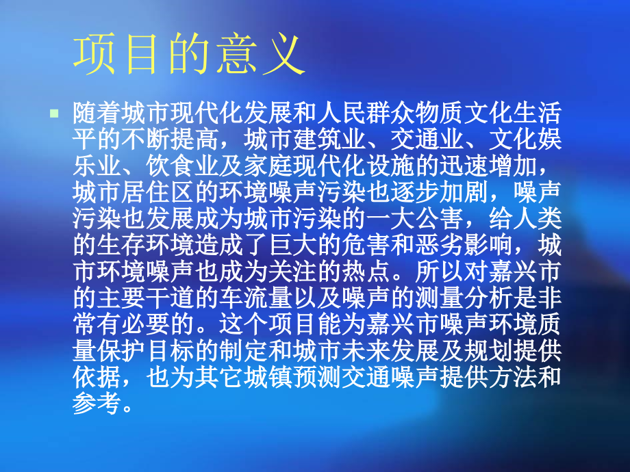 单击此处编辑母版标题样式,单击此处编辑母版文本样式,第二级,第三级,第四级,第五级,#,单击此处编辑母版标题样式,单击此处编辑母版文本样式,第二级,第三级,第四级,第五级,0 1 2 3 4 ,单击此处编辑母版标题样式,单击此处编辑母版文本样式,第二级,第三级,第四级,第五级,#,单击此处编辑母版标题样式,单击此处编辑母版文本样式,第二级,第三级,第四级,第五级,#,单击此处编辑母版标题样式,单击此处编辑母版文本样式,第二级,第三级,第四级,第五级,#,嘉兴市机动车对交通噪声的影响,项目的意义,随着城市现代化发展和人民群众物质文化生活平的不断提高,城市建筑业、交通业、文化娱乐业、饮食业及家庭现代化设施的迅速增加,城市居住区的环境噪声污染也逐步加剧,噪声污染也发展成为城市污染的一大公害,给人类的生存环境造成了巨大的危害和恶劣影响,城市环境噪声也成为关注的热点。所以对嘉兴市的主要干道的车流量以及噪声的测量分析是非常有必要的。这个项目能为嘉兴市噪声环境质量保护目标的制定和城市未来发展及规划提供依据,也为其它城镇预测交通噪声提供方法和参考。,现状分析,嘉兴地处长三角洲杭嘉湖平原腹心地带,与上海、苏州、杭州等大中城市相邻,是浙江北部的主要交通枢纽。随着嘉兴市区经济和生活水平的提高,汽车持有量不断攀升,据嘉兴市汽车行业商会统计,嘉兴机动车保有量为,110,万辆,其中小型车,27,万辆,去年全市小型车保有量比前年增长,22%,。道路交通噪声污染事件频发,不仅影响正常的生产,生活,更为重要地是对当地居民的身体健康构成威胁。,凭借其优越的地理位置,再加上生活和经济水平的提高,使机动车的数量急剧增加,同时加剧了道路交通噪声的污染。给人类的生存环境造成了巨大的危害和恶劣影响。,项目实施方案,1,.,通过资料搜集和实地调研,分时段对嘉兴市区主要交通拥挤道路进行噪声源,车流量,路况等数据进行实测。,2.,定性和定量指标结合的研究方法,利用,FHWA,公路噪音预测模式和我国交通部推荐的噪声预测模型对嘉兴市区主要交通干线的噪声污染做出客观,定量和定性的评价,。,3.,通过对采集样本数据的处理和统计分析,对嘉兴市区的交通状况做个大概评价,并提出控制噪声污染的合理化建议和辅助信息。,项目总体执行进展情况概述,(一)通过资料搜集和实地调研,分时段对嘉兴市区主要交通拥挤道路进行噪声源,车流量,路况数据实测。,(,1,)根据资料收集和实地调研结果,主要对,昌盛南路,,,中山西路,,,中环西路,,,中山西路,,,洪兴路,,,禾兴南路,,,勤俭路,等路线交叉复杂,交通拥挤的十字路口进行噪声,,车流量,和路况的监测。,(,2,)测量时间分别为平时和周末的早上,7:45-8:45,和傍晚,16:45-17,:,45,,该两时段为交通最拥堵时间,测量的数据具有比较强的针对性,。,(,2,)对比监测地段历年噪声等数据,对监测 区域的噪声污染状况作出评判,.,(二)采用定性和定量指标相结合的研究方法,利用,FHWA,公路噪音预测模型和我国交通部推荐的噪声预测模型对嘉兴市区主要交通干线的噪声污染状况做出评价,(,1,)对采集的数据进行整理、分析,利用,FHWA,公路噪音预测模型和我国交通部推荐的噪声预测模型对数据进行拟合计算,得到各地段的噪声值等数据,.,美国的,FHWA,模式,总等效声级,某一类车辆的小时等效声级,Leq(,),i,第,i,类车的小时等效声级,,dB(A),第,i,类车的参考能量平均辐射声级,,dB(A),N,i,在指定的时间,T(1h),内通过某预测点的第,i,类车流量,D,0,测量车辆辐射声级的参考位置距离,,D,0,=15m,D,从车道中心到预测点的垂直距离,,m,S,i,第,i,类车的平均车速,km/h,T,计算等效声级的时间,,1h,a,地面覆盖系数,取决于现场地面条件,,a=0,或,a=0.5,a,代表有限长路段的修正函数,其中,1,、,2,为预测点到有限长路段两端的张角,(rad),S,由遮挡物引起的衰减量,,dB(A),我国,交通,部推荐的,噪声预测模式,按照交通部,JTJ 005-96,公路建设项目环境影响评价规范(试行),中有关噪声模式和算法,预测点昼间或夜间的环境噪声预测值应按下式计算,各型车辆昼间或夜间使预测点接到的交通噪声值应按下式计算,(,L,Aeq,),预,-,-,预测点昼间或夜间的环境噪声预测值,,dB,(,L,Aeq,),背,-,预测点预测时的环境噪声背景值,,dB,L,1,-,公路曲线或有限长路段引起的交通噪声修正量,,dB,(,L,Aeq,),L,、,(,L,Aeq,),M,、,(,L,Aeq,),S,-,-,分别为大、中、小型车辆昼间或夜间,预测点接到的交通噪声值,,dB,L,2,-,公路与预测点之间的障碍物引起的交通噪声修正量,,dB,(,L,Aeq,),交,-,预测点接收到的昼间或夜间的交通噪声值,,dB,下阶段工作计划:,通过对采集样本数据的处理和统计分析,对嘉兴市区的交通状况做出评价,并提出控制噪声污染的合理化建议。,预计成果:,撰写一篇有关嘉兴市区噪声污染控制的科研论文。,Thanks,