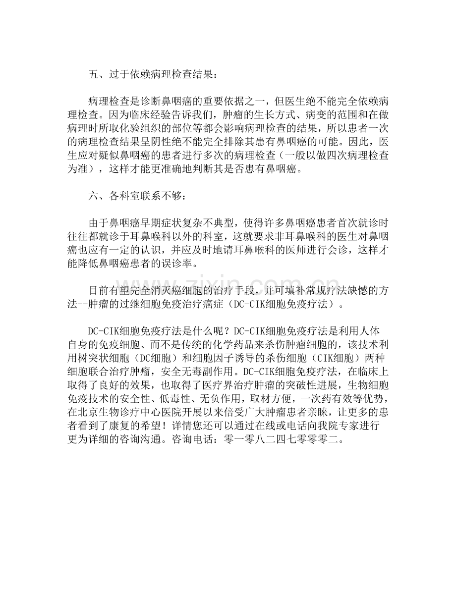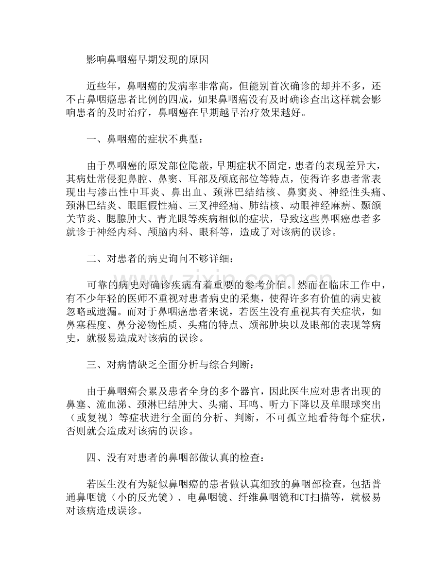 由于鼻咽癌早期症状复杂不典型,使得许多鼻咽癌患者首次就诊时往往都就诊于耳鼻喉科以外的科室,这就要求非耳鼻喉科的医生对鼻咽癌也应有一定的认识,并应及时地请耳鼻喉科的医师进行会诊,这样才能降低鼻咽癌患者的误诊率。