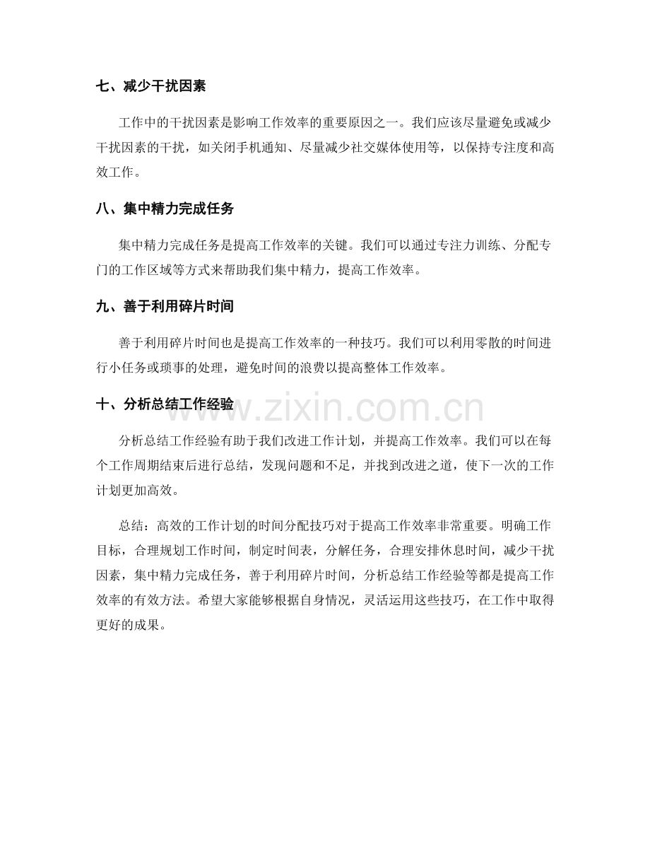 总结:高效的工作计划的时间分配技巧对于提高工作效率非常重要。明确工作目标,合理规划工作时间,制定时间表,分解任务,合理安排休息时间,减少干扰因素,集中精力完成任务,善于利用碎片时间,分析总结工作经验等都是提高工作效率的有效方法。希望大家能够根据自身情况,灵活运用这些技巧,在工作中取得更好的成果。