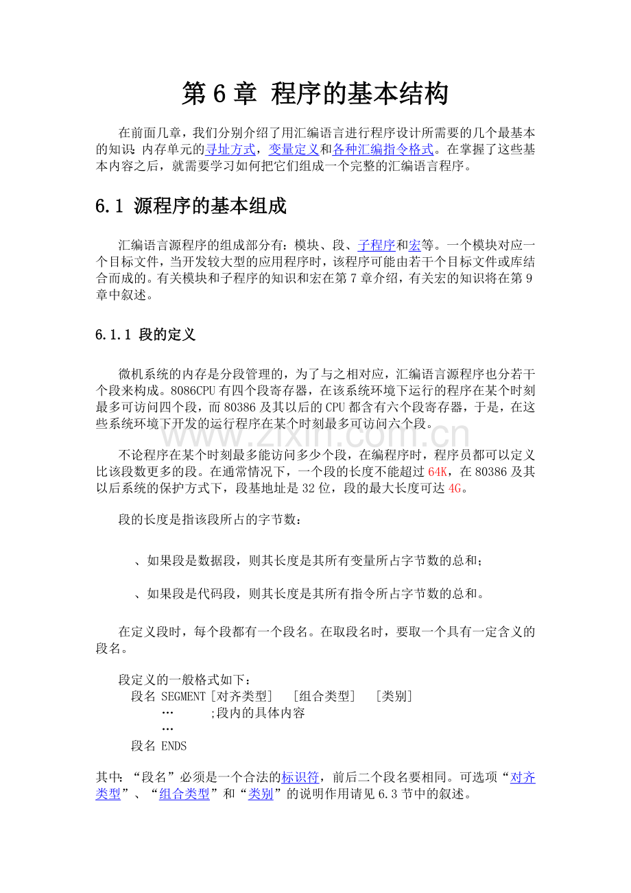 汇编语言源程序的组成部分有:模块、段、子程序和宏等。一个模块对应一个目标文件,当开发较大型的应用程序时,该程序可能由若干个目标文件或库结合而成的。有关模块和子程序的知识和宏在第7章介绍,有关宏的知识将在第9章中叙述。