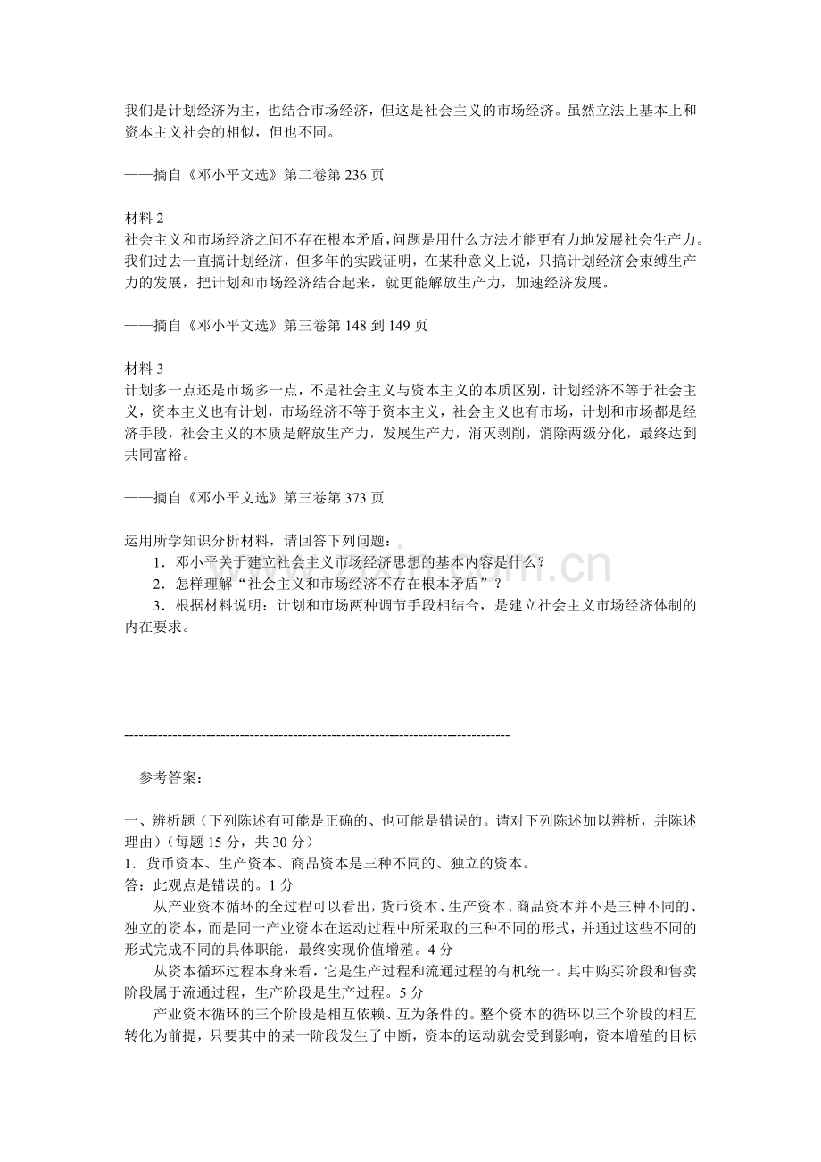 答:1.(1)计划经济不等于社会主义,市场经济不等于资本主义。必答点(2分)