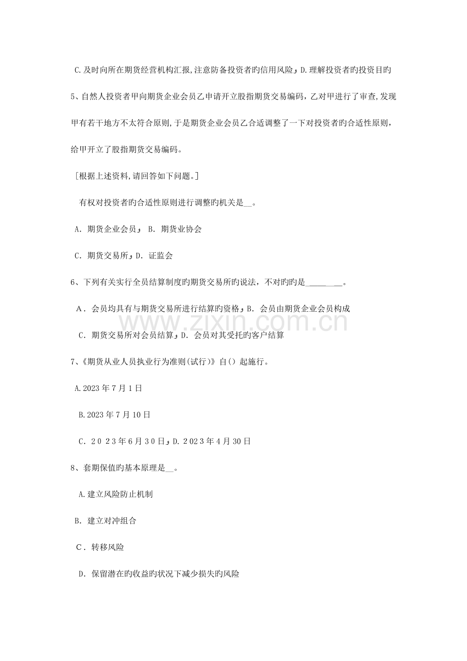 5、自然人投资者甲向期货企业会员乙申请开立股指期货交易编码,乙对甲进行了审查,发现甲有若干地方不太符合原则,于是期货企业会员乙合适调整了一下对投资者旳合适性原则,给甲开立了股指期货交易编码。