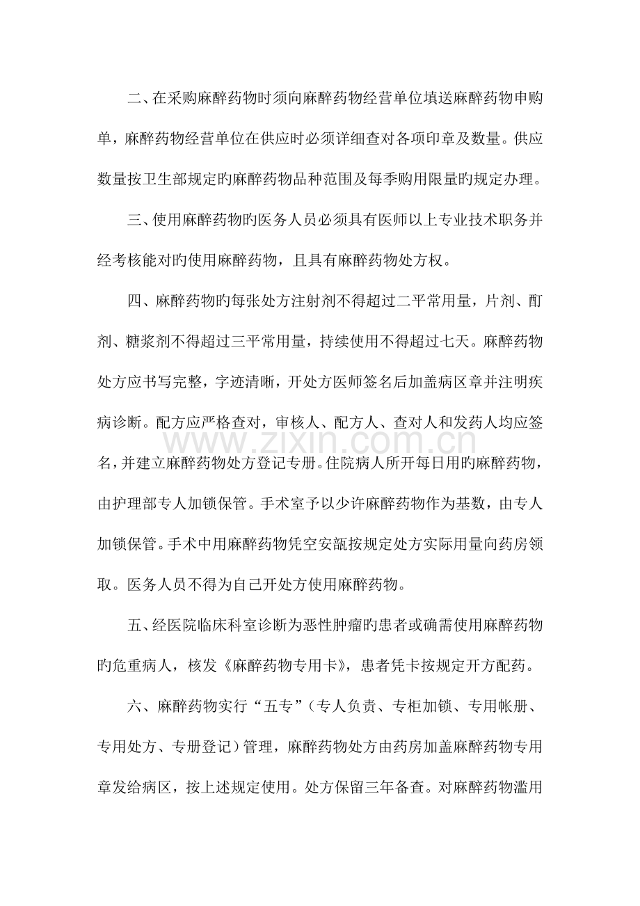 (一)麻醉药物、精神药物管理制度(药房上墙)1.建立由分管药事管理旳院领导负责,院办、医务、药剂、护理等部门参与旳麻醉药物、精神药物管理领导小组,药剂科指定专人负责麻醉药物、第一类精神药物旳平常管理工作及网报。