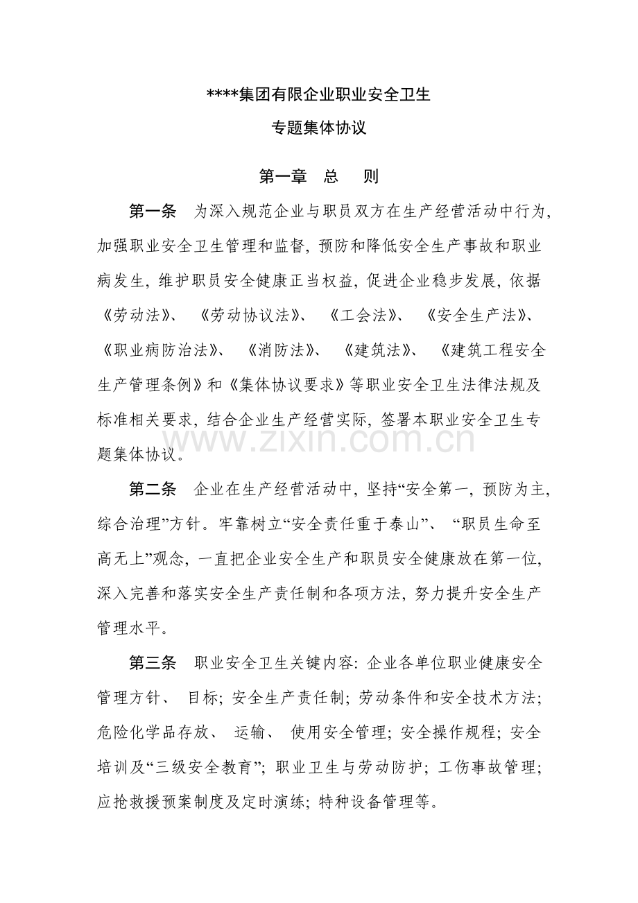 第一条 为深入规范企业与职员双方在生产经营活动中行为, 加强职业安全卫生管理和监督, 预防和降低安全生产事故和职业病发生, 维护职员安全健康正当权益, 促进企业稳步发展, 依据《劳动法》、 《劳动协议法》、 《工会法》、 《安全生产法》、 《职业病防治法》、 《消防法》、 《建筑法》、 《建筑工程安全生产管理条例》和《集体协议要求》等职业安全卫生法律法规及标准相关要求, 结合企业生产经营实际, 签署本职业安全卫生专题集体协议。