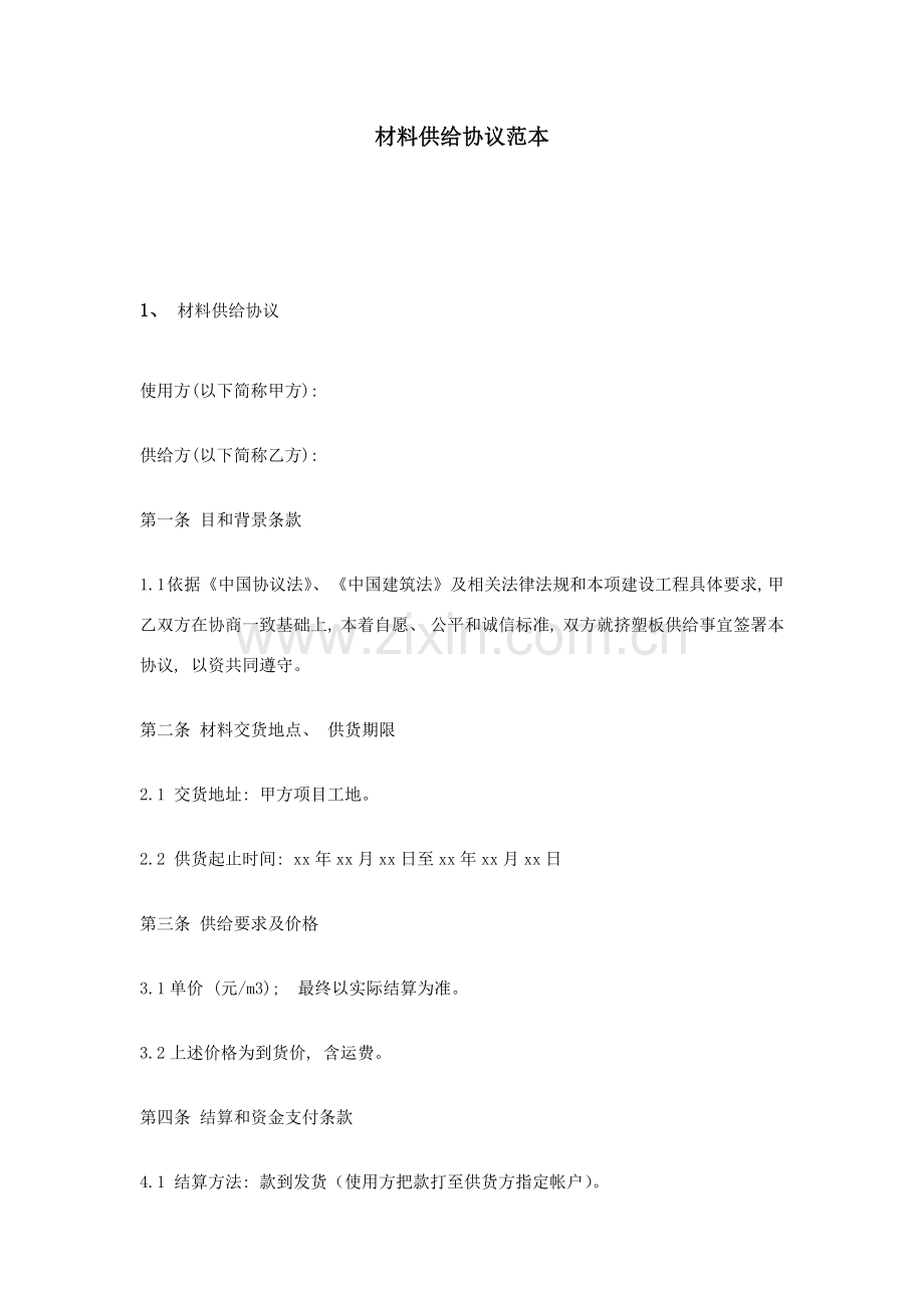 1、 乙方应按协议要求立刻保质保量供给材料, 如不能按时供给, 或供给材料不合格, 由此给甲方造成损失, 乙方应负责赔偿。