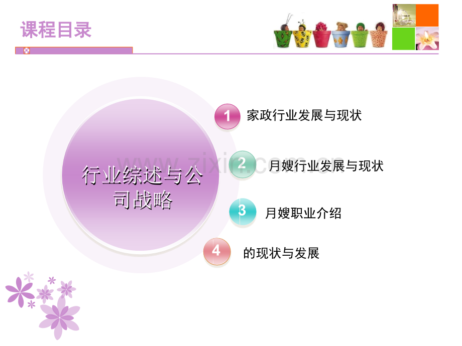 加盟商培训系列课程加盟商培训系列课程 行业综述与公司战略行业综述与公司战略 课程目录课程目录月嫂职业介绍行业综述与公行业综述与公司战略司战略123家政行业发展与现状月嫂行业发展与现状的现状与发展4家政v【名称】:家政v释义:家庭事务的管理工作。v【出处】:宋陈亮凌夫人何氏墓志铭:“家政出于舅姑,而辅其内事惟谨,房户细碎,无不整办。”明王铎太子少保兵部尚书节寰袁公神道碑:“顾夫人摄家政甚肃,一一皆当公(袁可立)意。”明方孝孺与采苓先生书之二:“执事以高年厚德主家政,一门之内英才异能者如云。”清李渔怜香伴逢怒:“如今舍表妹自愿做小,要求令爱主持家政家政。”v【示例】:老舍骆驼祥子五:“大太太与二太太一向是不和的,可是在家政家政上,二位的政见倒一致,其中的一项是不准仆人闲一会儿,另一项是不肯看仆人吃饭。”v西方的家政理念产生于近代。1899年在美国平湖召开的第一次家政会议,把家政学定义为HomeEconomics(家庭经济学),家政主要为家庭经济管理活动。家政学发展简史家政学发展简史v1899年9月,第一次家政学学术会议在美国纽约召开。1909年美国家政学协会成立。v根据联合国教科文组织和国际家政学协会联合发布的调查报告显示:全世界至少40%的国家已把家政列为家庭教育、社会教育、基础教育、技能教育的必修课。v我国最早的学校家政教育始于1904年,大学家政教育始于1919年。v1949年后,家政学作为一门独立学科处于停滞发展状态。直到80年代中期以后,随着社会经济发展,消费观念转变,生活节奏加快,家庭小型化,人口老龄化、服务社会化,技术专业化,以及人们对家庭生活质量追求越来越高,家庭事务出现社会化和职业化发展趋势,从事家政研究、培训、经营、管理、服务等部门和机构雨后春笋,以家庭为主要服务对象并以家庭事务处理和管理为职业的家政员队伍迅速壮大。v2006年,我国依据中华人民共和国劳动法有关规定制订并颁布了家政服务员国家职业标准。v家政学是研究家庭生活家庭生活规律,以提高生活质量为目的的综合性应用学科,是从事家政服务和家庭管理实践的理论基础。我爱我妻我爱我妻中国月嫂第一品牌中国月嫂第一品牌一一家政行业发展与现状课程目录课程目录一、家政行业发展与现状一、家政行业发展与现状 党的十七大把关注民生,科学发展,创造社会和谐作为我们党为之奋斗的一个重要目标明确提了出来。社会主义和谐社会是家庭幸福、社会稳定、就业充分、人们的各种需求得到进一步满足、社会群体各种利益关系得到有效协调的社会。行业大背景行业大背景我爱我妻我爱我妻中国月嫂第一品牌中国月嫂第一品牌 当前,在经济全球化、我国经济与世界经济紧密联系的大背景下。针对严峻的形势,党中央、国务院及时调整宏观政策,把关注民生、倡导科学发展,促进社会和谐和经济平稳发展作为当前我国的首要任务。这对服务民生的家政行业来说无疑是一个很好的发展机遇。一、家政行业发展与现状一、家政行业发展与现状中国的经济、世界的舞台中国的经济、世界的舞台国策国情为中国家政服务业带来发展机遇国策国情为中国家政服务业带来发展机遇1、男女平等让女性有了更多的就业岗位;2、独生子女政策让家政服务走入了家庭;3、社会经济的发展让享受生活有了可能;4、改革开放成果呼唤高质量的家政服务。l随着国民经济的发展和人民生活水平的提高,家庭、个人对生活品质的要求愈来愈高。社会的进步带来的是社会生产的专业化和社会分工的细化。家务劳动从家庭走向社会,从自我服务走向市场服务是一种发展趋势。l而现代家庭服务业的发展一方面提高了家庭精神生活和物质生活质量,另一方面也为广大的待业、从业人员带来了通畅的就业渠道和广阔的就业市场,因而也促进了社会的安定与和谐。一、家政行业发展与现状一、家政行业发展与现状家庭服务业为家庭幸福就业充分创造了条件家庭服务业为家庭幸福就业充分创造了条件一、家政行业发展与现状一、家政行业发展与现状 2009年6月28日上午,中共中央政治局常委、国务院总理温家宝在山东省委书记、省人大常委会主任姜异康,省委副书记、省长姜大明等陪同下,至济南阳光大姐家政服务有限责任公司考察就业情况。我爱我妻我爱我妻中国月嫂第一品牌中国月嫂第一品牌一、家政行业发展与现状一、家政行业发展与现状l随着现代生活品质的提升和社会分工的细化,家政服务带着全新的理念和日益丰富的内涵悄然走进了寻常百姓的生活。l然而,作为一种新兴的产业,我国的家政服务还处在较为粗糙和低级的阶段,观念的混杂、制度的缺失、监管的空白和运作的失范,让人们不禁慨叹:l家政服务在充分展示其独特的人文关怀的同时,似乎还缺少点什么?我们离和谐社会的距离到底还有多远?我们离和谐社会的距离到底还有多远?我爱我妻我爱我妻中国月嫂第一品牌中国月嫂第一品牌l从事家政的服务人员是自由人而不是职业人,l从事家政的企业是中介行为而不是管理行为。l家政企业对用户的信誉危机l用户对家政企业的信任危机l员工对家政企业的忠诚危机 一、家政行业发展与现状一、家政行业发展与现状当前困扰家政市场的两大问题,三大危机当前困扰家政市场的两大问题,三大危机(一)劳