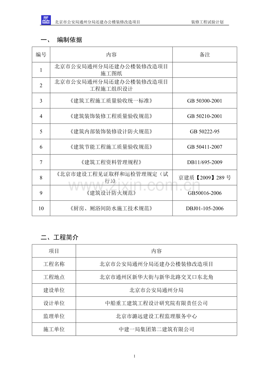 北京市公安局通州分局还建办公楼装修改造项目 装修工程试验计划