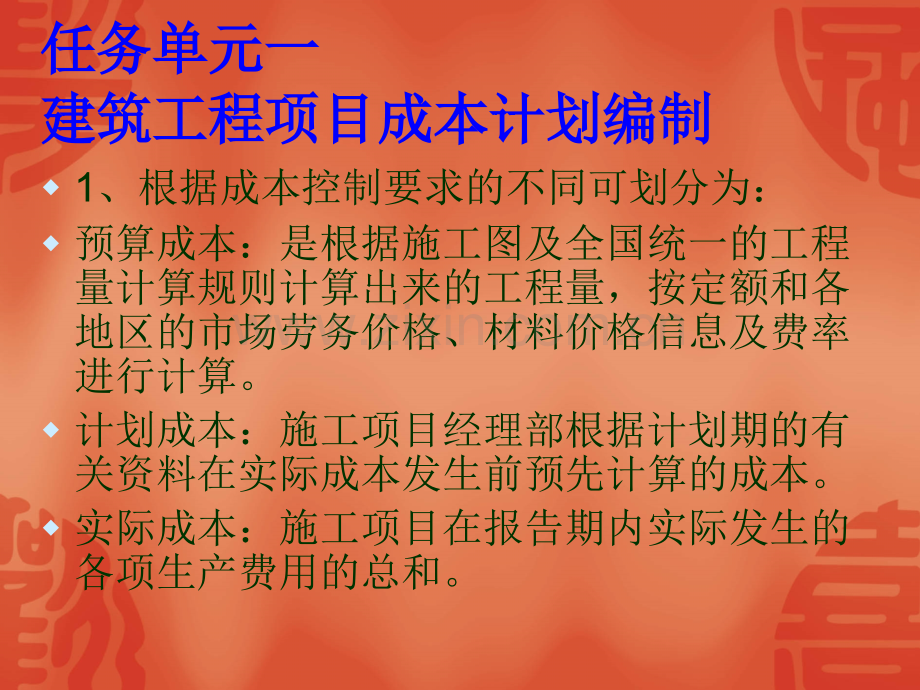 w学习目标w1.了解:建筑工程项目戚本计划编制依据。w2.熟悉:建筑工程项目戚本的构成,成本计划的分类、成本核算、戚本考核等内容。w3.掌握:建筑工程项目戚本管理的概念,成本计划编制方法,成本控制方法,赢得值法的意义,成本分析的方法。任务单元一任务单元一 建筑工程项目成本计划编制建筑工程项目成本计划编制w1、根据成本控制要求的不同可划分为:w预算成本:是根据施工图及全国统一的工程量计算规则计算出来的工程量,按定额和各地区的市场劳务价格、材料价格信息及费率进行计算。w计划成本:施工项目经理部根据计划期的有关资料在实际成本发生前预先计算的成本。w实际成本:施工项目在报告期内实际发生的各项生产费用的总和。w2、按照生产费用计入成本方法的不同,可划分为:w直接成本:指直接耗用的并能直接计入工程对象的费用;w间接成本:指非直接耗用的、也无法直接计入工程对象的,但为进行工程施工所必须发生的费用。w3、按照生产费用与工程量关系的不同,可划分为:w固定成本:指在一定期间和一定的工程量范围内发生的成本额不受工程量增减变动的影响而相对固定的成本。w变动成本:发生总额随着工程量的增减变化而成正比例变动的费用。w施工成本管理的任务主要包括:w施工成本预测施工成本计划施工成本控制施工成本核算施工成本分析施工成本考核。w一、建筑安装工程费项目组成w建筑安装工程费由直接费、间接费、利润和税金组成。w二、建筑工程项目成本计划类型w1.竞争性成本计划w竞争性成本计划即建筑工程项目投标及签订合同阶段的估算成本计划。w2.指导性成本计划w指导性成本计划即选派项目经理阶段的预算成本计划,是项目经理的责任成本目标。w3.实施性成本计划w实施性成本计划即建筑工程项目准备阶段的施工预算成本计划。w三、建筑工程顶目成本计划的编制依据w1)投标报价文件。w2)企业定额、施工预算。w3)施工组织设计或施工方案。w4)人士、材料、机械台班的市场价。w5)企业颁布的材料指导价、企业内部机械台班价格、劳动力内部挂牌价格。w6)周转设备内部租赁价格、摊销损耗标准。w7)己签订的工程合同、分包含同(或估价书)。w8)结构件外加工计划和合同。w9)有关财务成本核算制度和财务历史资料。w10)施工成本预测资料。w11)拟采取的降低施工成本的措施。w12)其他相关资料。w四、建筑工程项目成本计划的编制方法w1.接建筑工程项目成本组成编制成本计划w2.接项目组成编制建筑工程项目成本计划w3.接工程进度编制建筑工程项目成本计划w1)确定建筑工程项目进度计划,编制进度计划的横道图。w2)根据每单位时间内完成的实物二程量或投入的人力、物力和财力,计算单位时间(月或旬)的成本,在时标网络图上按时间编制成本支出计划。w3)计算规定时间t计划累计支山的成本额。w4)按各规定的Qt值,绘制S形曲线。任务单元二任务单元二 建筑工程项目成本控制建筑工程项目成本控制w一、建筑工程项目成本控制的依据w1.工程承包合同w2.建筑工程项目成本计划w3.进度报告w4.工程变更成本控制的组织成本控制的组织w(1)建立以项目经理为核心的项目成本控制体系。w(2)建立施工项目成本控制责任制。w项目经理:w全面负责项目成本控制工作,是项目成本控制的责任中心;负责项目成本的预测、目标成本、成本控制实施、成本核算和成本分析考核等工作w合同预算员:w根据合同内容、预算定额和有关规定,充分利用有利因素,编好施工图预算;深入研究合同规定的“开口”项目,在有关管理人员的配合下,努力增加工程收入;收集工程变更资料,及时办理收入账,保证工程收入,及时收回垫付的资金;参加对外经济合同的谈判与决策,以施工图预算和收入账为依据,审核经济合同的数量、单价和金额,切实做到“以收定支”w工程技术人员:w根据施工现场的实际情况,合理规划施工现场平面布置,为文明施工、减少浪费创造条件;严格执行工程技术规范和预防为主的方针,确保工程质量,减少零星修补,消灭质量事故,不断降低质量成本;根据工程特点和设计要求,运用自身的技术优势,采取实用、有效的技术组织措施和合理化建议;严格执行安全操作规定,减少一般安全事故,消灭重大人身伤亡事故和设备事故,确保安全生产w材料人员:w材料采购和构件加工,要选择质高、价低、运距短的供应(加工)单位。对到场的材料、构件要正确计量、认真验收,如遇质量差、量不足的情况,要进行索赔。切实做到:一要降低采购(加工)成本,二要减少采购(加工)过程中的管理损耗;根据施工计划进度,及时组织材料、构件的供应,保证项目施工的顺利进行,防止因停工待料造成的损失。在构件加工的过程中,要按照施工的顺序组织配料供应,以免因规格不齐造成施工间歇、浪费时间与人力;在施工过程中,严格执行限额领料制度,控制材料消耗;同时,还要做好余料回收和利用,为考核材料实际消耗水平提供正确的依据;钢管脚手架和钢模板等周转材料,进出现场都要认真清点,正确核实并减少赔偿数量;使用后,要及时回收、整理、堆放,并及时退场,既可节省租赁费,又有利于场地整洁,还可加速周转,提高利用效率;根据施工生产的需要,合理安排材料储备,减少资金的占用,提高资金的利用效率w机械管理人员:w根据工程特点和施工方案,合理选择机械的型