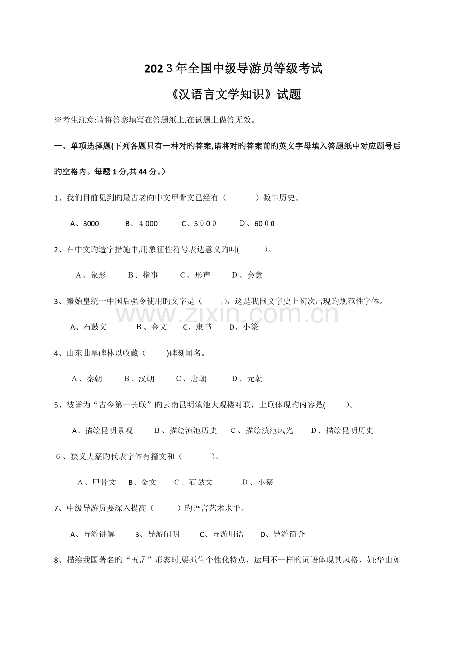2023年全国中级导游员等级考试