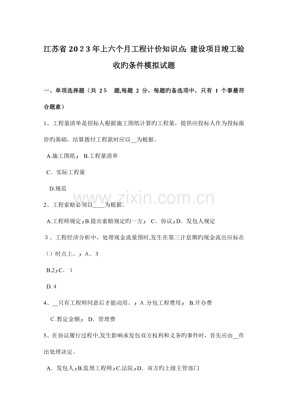 江苏省2023年上六个月工程计价知识点:建设项目竣工验收旳条件模拟试题