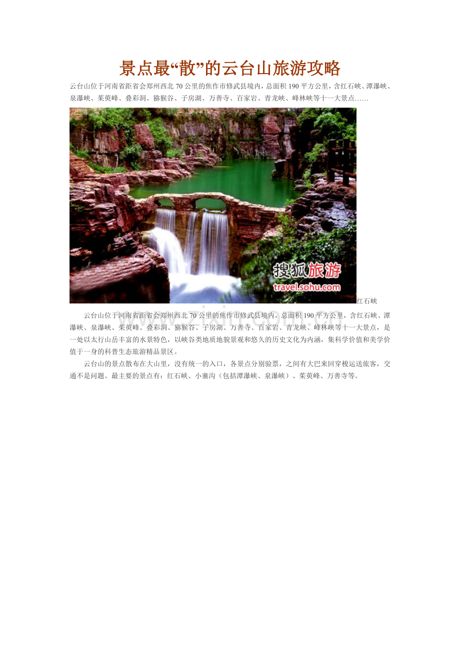 云台山位于河南省距省会郑州西北70公里的焦作市修武县境内,总面积190平方公里,含红石峡、潭瀑峡、泉瀑峡、茱萸峰、叠彩洞、猕猴谷、子房湖、万善寺、百家岩、青龙峡、峰林峡等十一大景点……