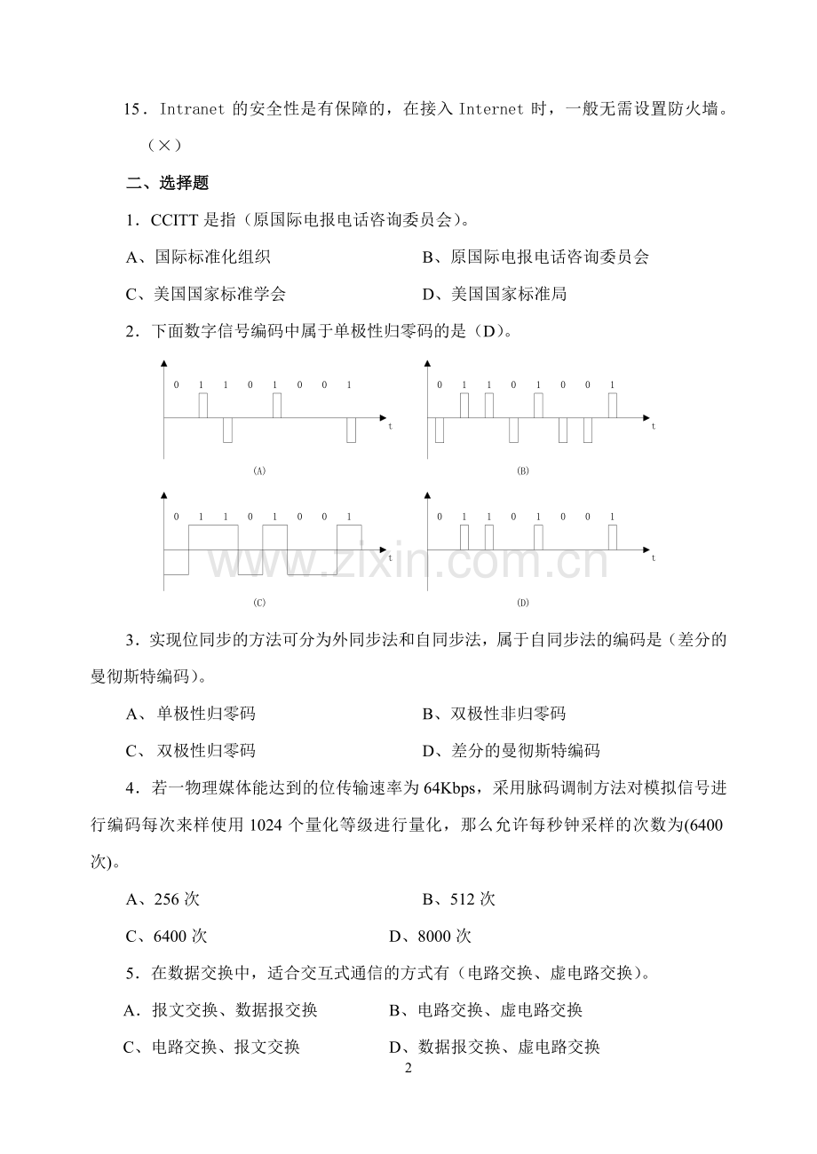 2.用数字信号传输模拟数据,需要使用编码解码器完成模拟数据和数字信号的转换。((√)