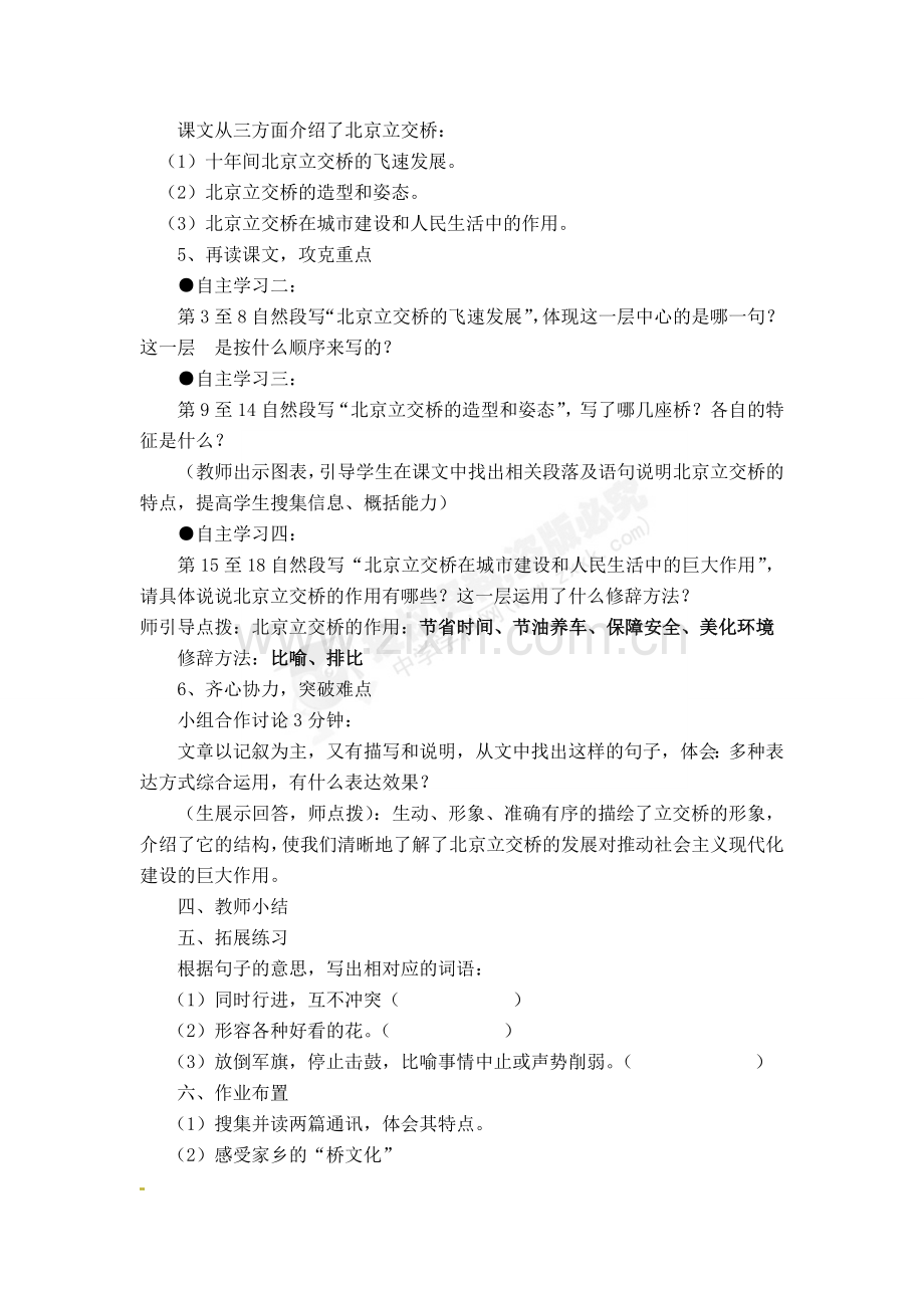 (生展示回答,师点拨):生动、形象、准确有序的描绘了立交桥的形象,介绍了它的结构,使我们清晰地了解了北京立交桥的发展对推动社会主义现代化建设的巨大作用。