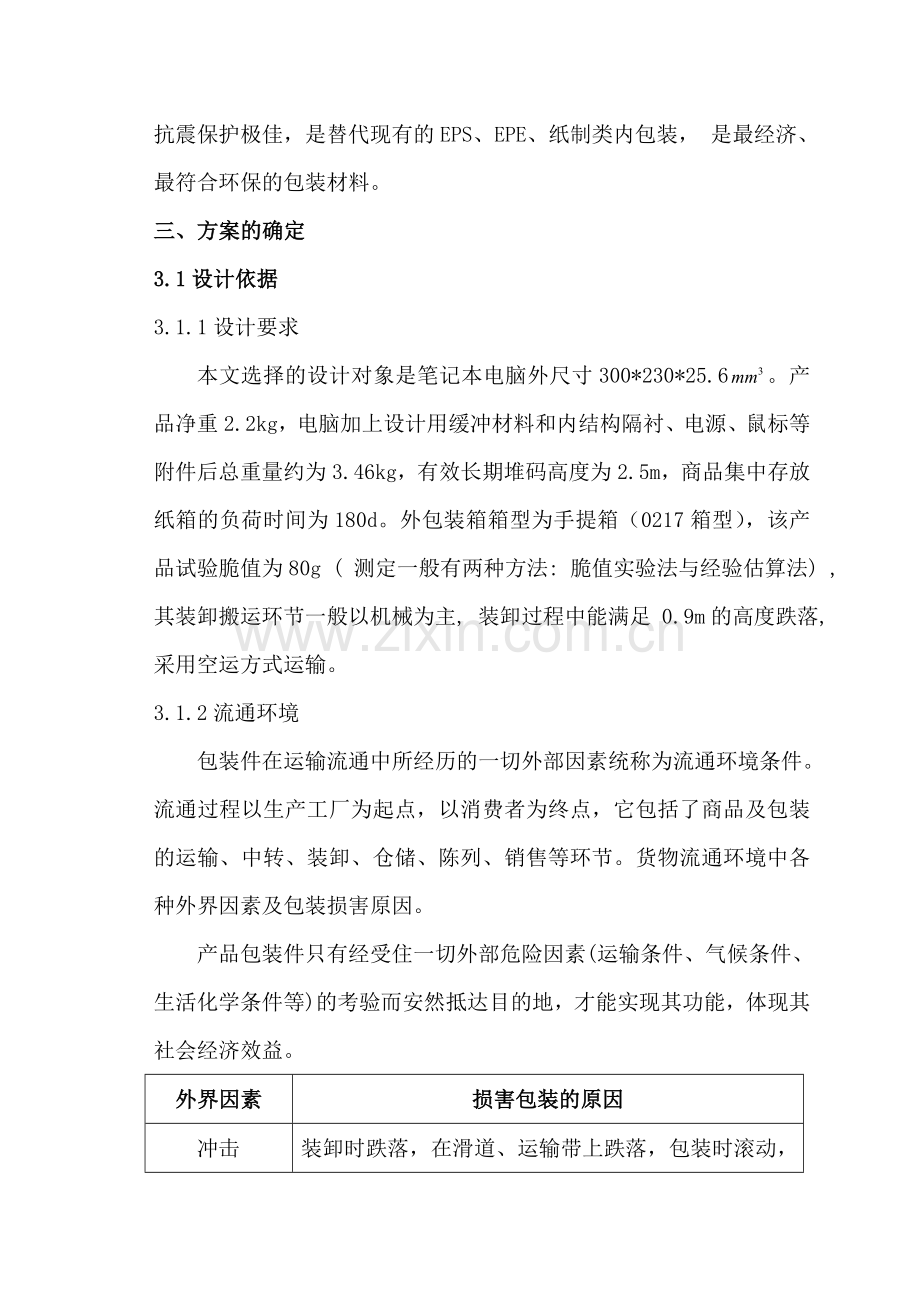 通过对产品笔记本电脑本身特性、原有包装结构、流通环境、包装废弃物的分析,提出了一种新的包装结构——瓦楞纸板与气垫的复合包装。这种新型的复合包装与原有的全瓦楞纸板相比较可降低包装成本、运输成本以及碳排量,是符合现在包装趋势的设计。