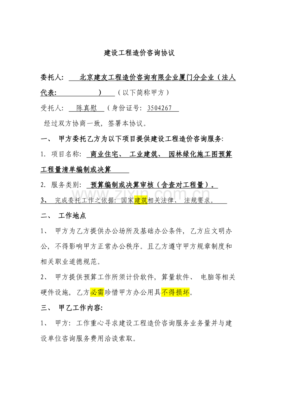 委托人: 北京建友工程造价咨询有限企业厦门分企业(法人代表: ) (以下简称甲方)