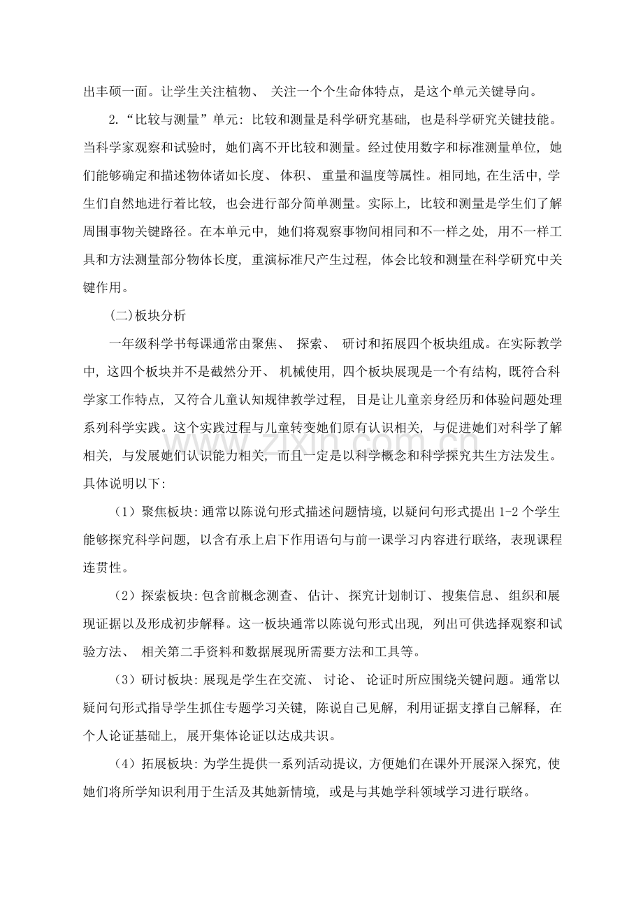 一年级上册科学教学内容由“植物”和“比较与测量”两个单元组成。其中“植物”单元有6个教学内容, “比较与测量”单元有7个教学内容, 总计13个教学内容, 标准上每个教学内容需1课时来完成教学。另外每个单元最终都有“科学阅读”内容。