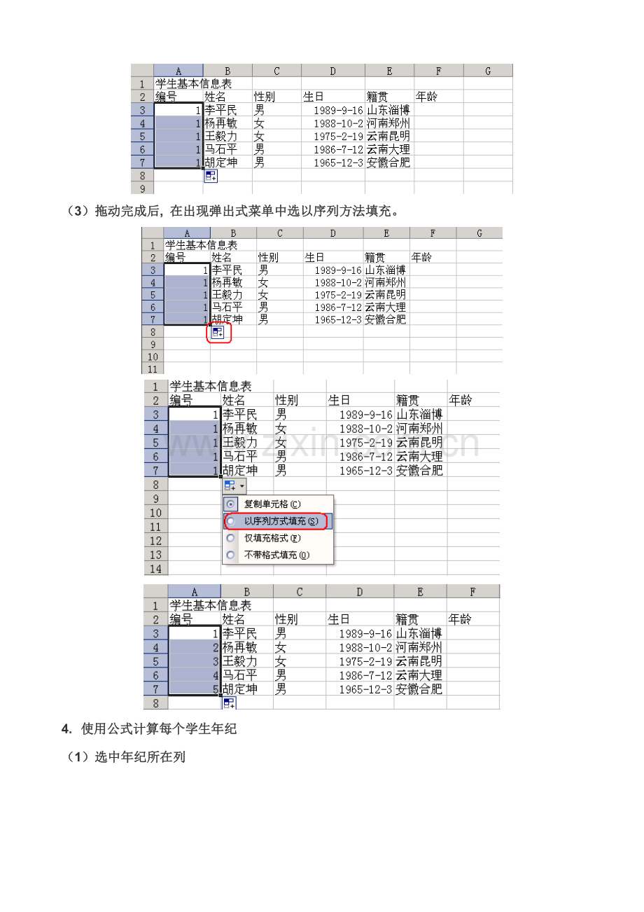 (5)将鼠标放到F3单元格右下角控制点上, 并按下鼠标左键向上拖动, 并实现计算其她学生年纪功效。