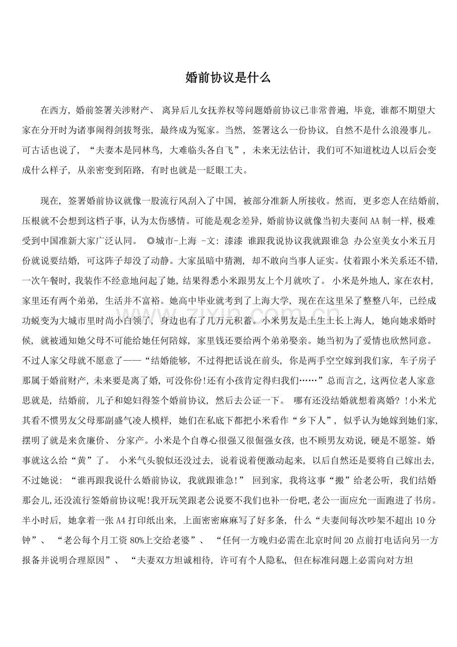 是指将要结婚男女双方为结婚而签署、 于婚后生效含有法定约束力书面协议。关键目是对双方各自财产和债务范围以及权利归属等问题实现作出约定, 以免未来离婚或一方死亡时产生争议。