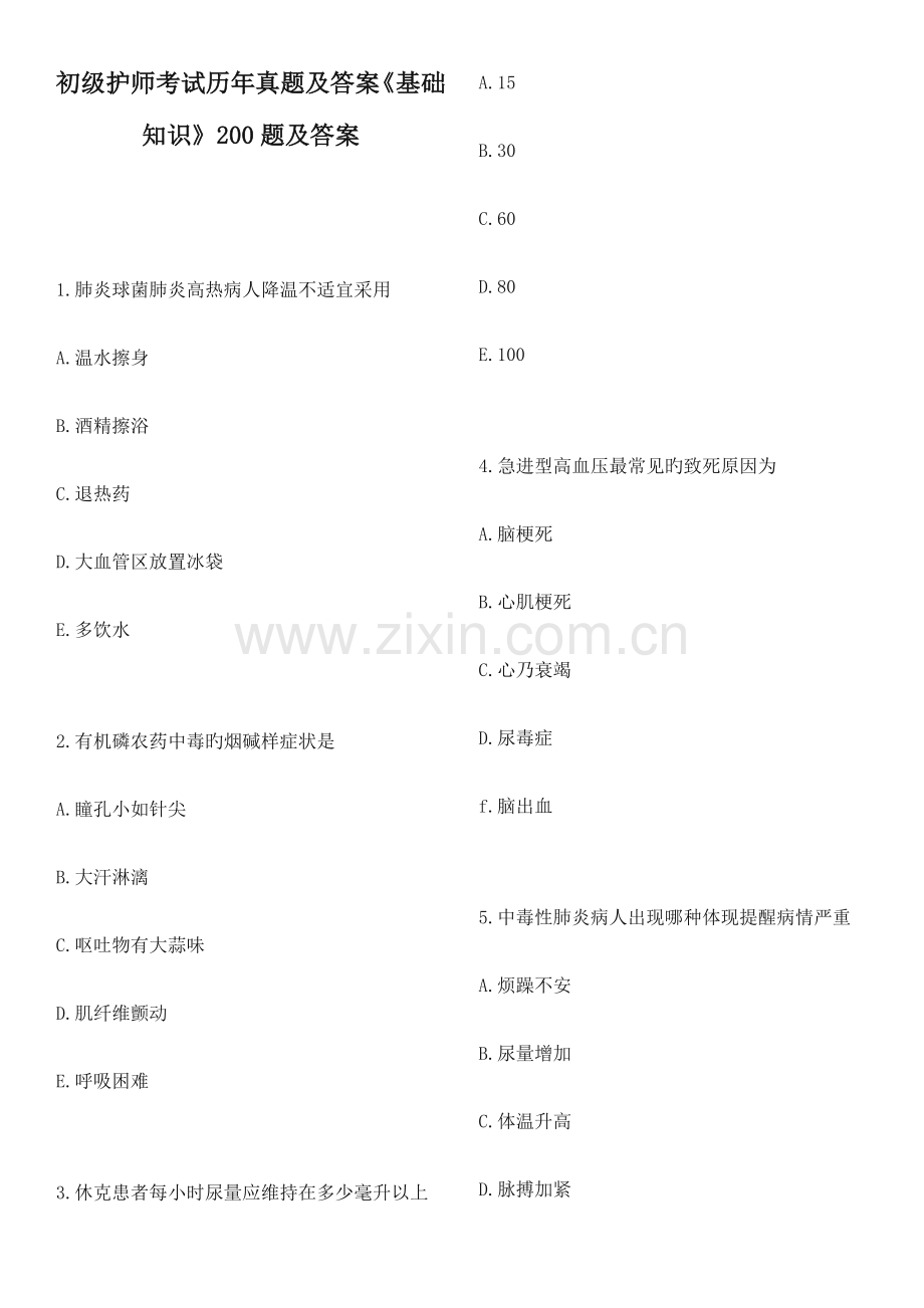 初级护师考试历年真题及答案《基础知识》200题及答案
