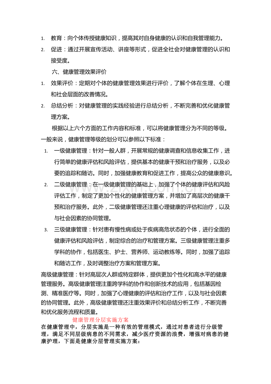 2. 二级健康管理:在一级健康管理的基础上,加强了个体的健康评估和风险评估工作,制定了更加个性化的健康管理方案,并增加了高层次的健康干预和治疗服务。此外,二级健康管理还注重心理健康的评估和治疗,以及与社会因素的协同管理。