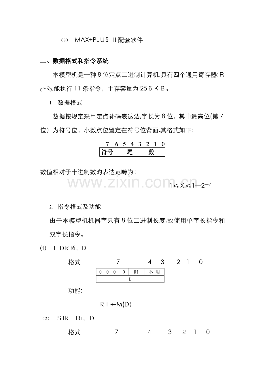 本模型机是一种8位定点二进制计算机,具有四个通用寄存器:R0~R3,能执行11条指令,主存容量为256KB。