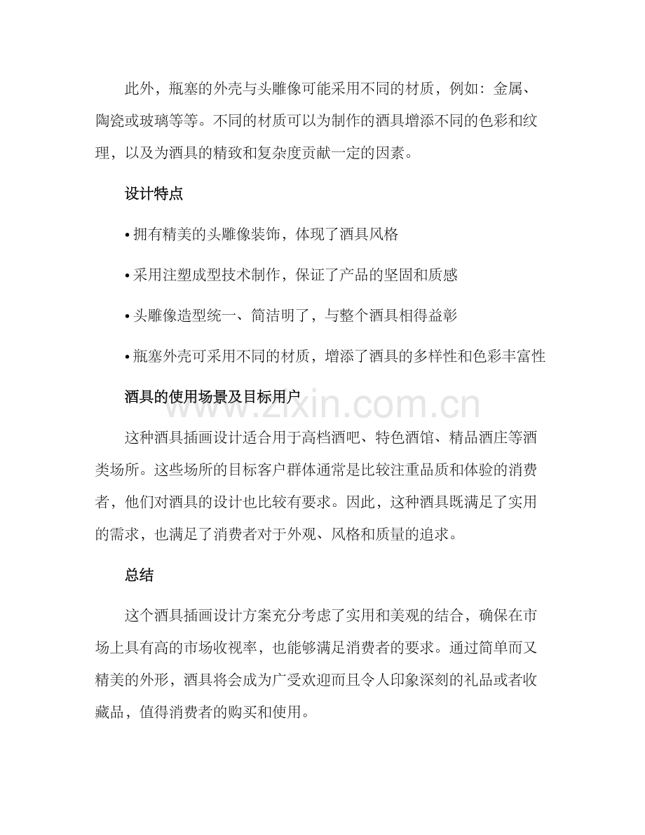 这个酒具插画设计方案充分考虑了实用和美观的结合,确保在市场上具有高的市场收视率,也能够满足消费者的要求。通过简单而又精美的外形,酒具将会成为广受欢迎而且令人印象深刻的礼品或者收藏品,值得消费者的购买和使用。