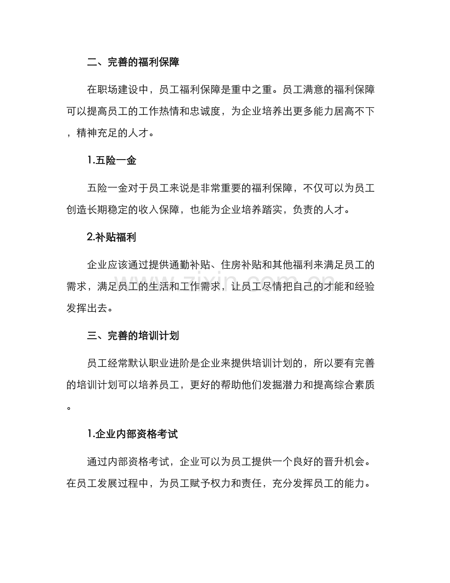 综上所述,企业职场建设方案是非常重要的。企业可以从工作环境、福利保障、培训计划和管理团队四个方面进行优化,提高员工工作效率和生产力,让企业得以高效稳步发展。