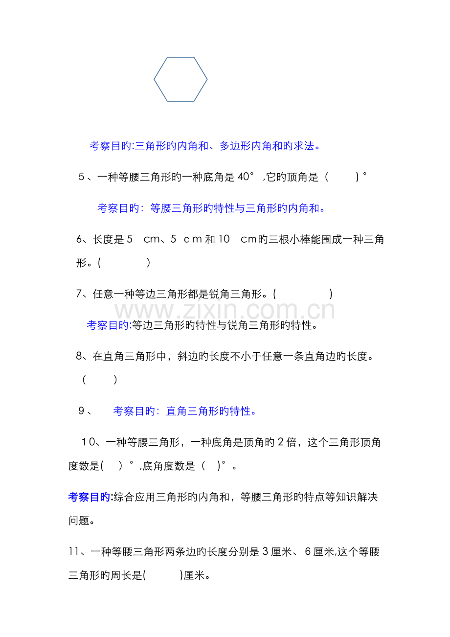 以盘龙区小学下学期期末四年级数学试题进行分析:三角形这一单元知识占11%,所考知识点重要有:锐角三角形、直角三角形、钝角三角形,等腰三角形等边三角形旳定义,三角形三边旳关系,高旳做法,会求三角形和多边形旳内角和。如: