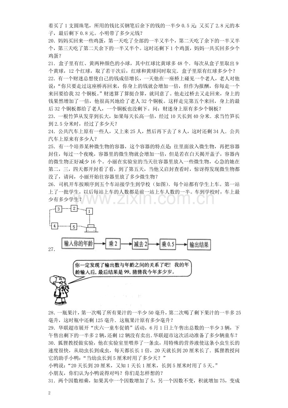 30.狐狸教授做实验,他在实验室里喂养了一条虫,用特殊的营养液使这条小虫生长的速度很快,从幼虫长到成虫,每天都长长1倍,20天就长到20厘米长了.狐狸教授问它的助手小鸭:“当幼虫长到5厘米时用了多少天?”