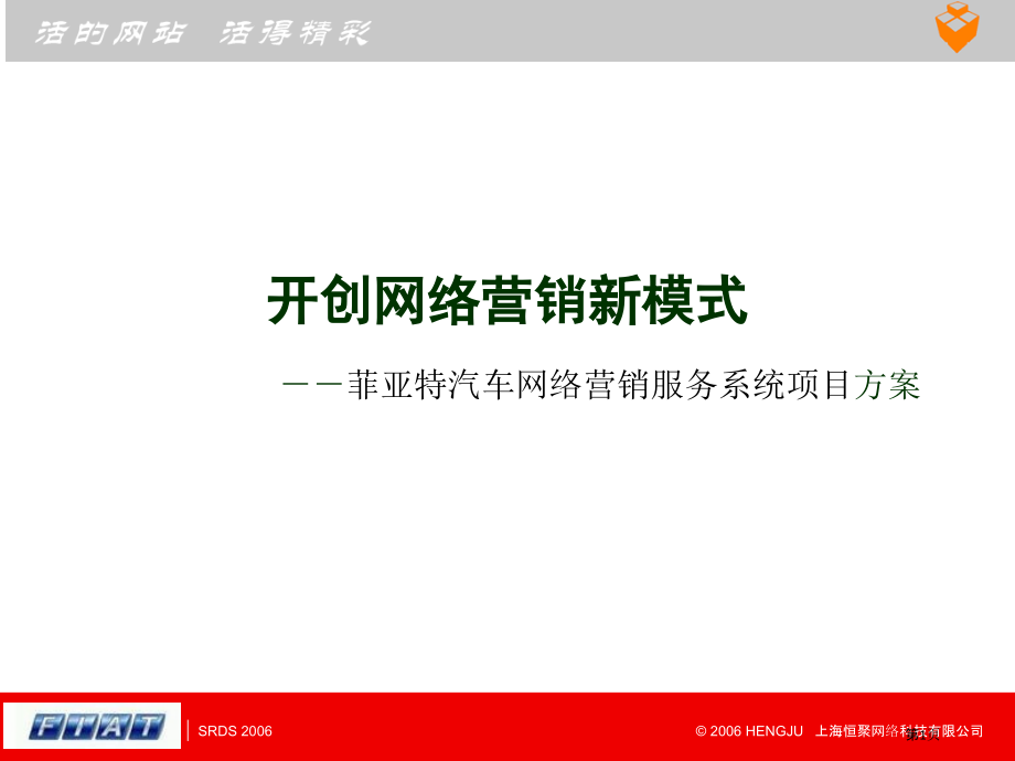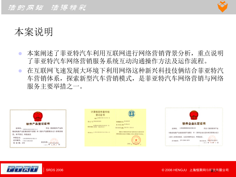 Click to edit Master title style,Click to edit Master text styles,Second level,Third level,Fourth level,Fifth level,*,*,单击此处编辑母版文本样式,第二级,第三级,第四级,第五级,*,*,单击此处编辑母版标题样式,2006 HENGJU 上海恒聚网络科技有限公司,SRDS 2006,单击此处编辑母版文本样式,第二级,第三级,第四级,第五级,*,*,单击此处编辑母版标题样式,2006 HENGJU 上海恒聚网络科技有限公司,SRDS 2006,开创网络营销,新模式,菲亚特汽车网络营销服务系统项目,方案,第1页,本案说明,本案阐述了菲亚特汽车利用互联网进行网络营销背景分析,重点说明了菲亚特汽车网络营销服务系统互动沟通操作方法及运作流程。,在互联网飞速发展大环境下利用网络这种新兴科技伎俩结合菲亚特汽车营销体系,探索新型汽车营销模式,是菲亚特汽车网络营销与网络服务主要举措之一。,第2页,目录,项目背景,项目说明,项目流程,项目预算,恒聚介绍,第3页,项目背景,第4页,中国上网计算机总数,中国上网用户总数,全国第18次互联网络发展情况统计调查结果显示中国互联网又进入了一个快速发展期,截至年6月网民人数已经到达了12300万人比去年同期增加19.4%,同1997年10月第一次调查62万网民人数相比,现在网民人数已是当初198.4倍,能够看出中国网民发展走势良好。,第5页,不一样方式上网所占百分比,不一样上网方式网民人数,不一样上网方式网民人数,互联网络在整体上保持快速增加同时,网民上网路径发生了较为显著改变,宽带上网网民人数7700万人,在全部网民中百分比已经到达62.6%,即使上网计算机总数保持增加,但专线上网计算机数、拨号上网计算机数依然为负增加,而宽带上网计算机数增加快速。,第6页,网民婚姻情况,网民文化程度,网民性别百分比,网民年纪分布,伴随互联网在中国发展和普及网民人数连续增加。网民特征结构也发生了对应改变,企业单位工作人员,占总数28.9%,学校教师及行政人员所占百分比为7.4%,国家机关、党群组织工作人员所占百分比为6.2%,事业单位工作人员所占百分比为5.6%,第7页,网民获取信息主要路径,网民平均每七天上网小时数,越来越多人开始接触互联网,网民队伍日益壮大,同时,经济条件逐步提升,互联网基础设施日趋完善以及工作、学习节奏不停加紧,人们对互联网使用也越来越频繁,互联网对人们生活影响力也逐步显现。,网络已经融入了我们生活,第8页,民众获取信息路径对比,互联网对网民帮助程度,伴随互联网发展,网络已经成为很多人工作生活好帮手。当前大约有2500万人经常使用网上招聘,1500万人经常使用网络教育;同时分别有大约900万人和600万人在享受网络电话和网上预订带来好处,而在线影视音乐收看及下载(在线电视、在线广播)规模已经超出了4000万。,第9页,年以博客为代表Web2.0概念推进了中国互联网发展,Web2.0概念出现标志互联网新媒体发展进入新阶段。在其被广泛使用同时,也催生出了一系列社会化新事物,比如Blog,RSS,WIKI,SNS交友网络等。,第10页,网站由静态到动态,网站由被动到主动,网站由单向到双向,Web,1.0,Web,2.0,网络营销服务系统实现网站三大转变,恒聚网络营销服务系统是Web2.0时代产物,能够帮助企业实现在线交流、实时客服、即时数据统计等服务项目,充分发挥了互联网功用,使现有企业网站得到了主要革新,是网络营销服务升级产品。,第11页,项目说明,第12页,.1-9,销售收入(亿元),4253.68,6772.61,9256.64,10849.55,8418(7.18%),利润(亿元),204.72,487.24,754.56,719.85,361(-39.29),销售收入利润率,4.8%,7.19%,8.15%,6.63%,4.29%,(亿元),汽车价格连续下降造成成本优势从年起将成为整车厂商竞争成败第一主要原因,在未来较长时间内仍将连续。整车企业必须在各个步骤降低成本,尤其主要是在营销体系方面低成本。,资料起源:国家信息中心,汽车厂商企业利润率,第13页,菲亚特汽车网络营销服务系统,汽车消费者行为分析,新车上市,媒介推广,激发关注,获取信息,网络查询,网络营销,第14页,菲亚特汽车网络营销服务系统,项目目标,利用国际领先网络应用技术制作厂商与消费者互动沟通网络桥梁系统,汽车消费者,菲亚特汽车,第15页,网页登陆,系统分配,技术特点,北京消费者,上海消费者,广州消费者,Web,北京网络,营销人员,上海网络,营销人员,广州网络,营销人员,系统管理,总服务台,数据统计,IT CT/支持,已激发关注,潜在消费者,分配,网页直接呼叫与应答过程,系统例举,1 数据加密采取了国际领先DES算法,确保了数据安全。,2 数据传输采取了当前最新AJAX技术,提升了网页对话操作反应速度。,3 语音功效采取FLASH应用技术开发,不需要额外安装插件即方便又安全。,4 服务器采取LINUX操作系统,含有很高安全性和稳定性。,菲亚特汽车网络营销服务系统,第16页,基本功效演示,演示地址:应用软件开发,网络营销软件,实时网络服务处理方案,致力于为互联网用户提供专业网络营销与实时网络服务处理方案互联网应用软件开发企业,第26页,网络服务系统关键技术是50多位科研人员利用JAVA技术历时近2年完全自主开发,先后取得了上海浦东科技局高级软件人才专题基金和国家科学技术部技术创新基金等众多奖项和荣誉,关键技术现已经到达了国内第一国际领先先进水平。,2006月 恒聚荣获“软件产品登记证书”,2005月 恒聚系列软件获“国家计算机软件著作权证书”,2001月 恒聚被天极网列为“20IT产业软件与信息化范围回顾对