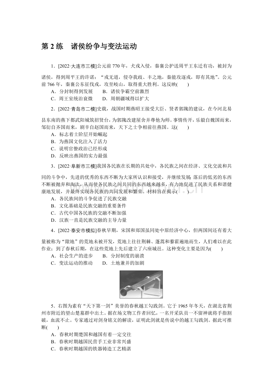 1.[2022·大连市三模]公元前770年,犬戎入侵,秦襄公护送周平王东迁有功,被封为诸侯,得到周平王的许诺:“戎无道,侵夺我歧、丰之地,秦能攻逐戎,即有其地”。公元前766年,秦襄公东征伐戎,攻至岐山,取得重大胜利。这反映( )